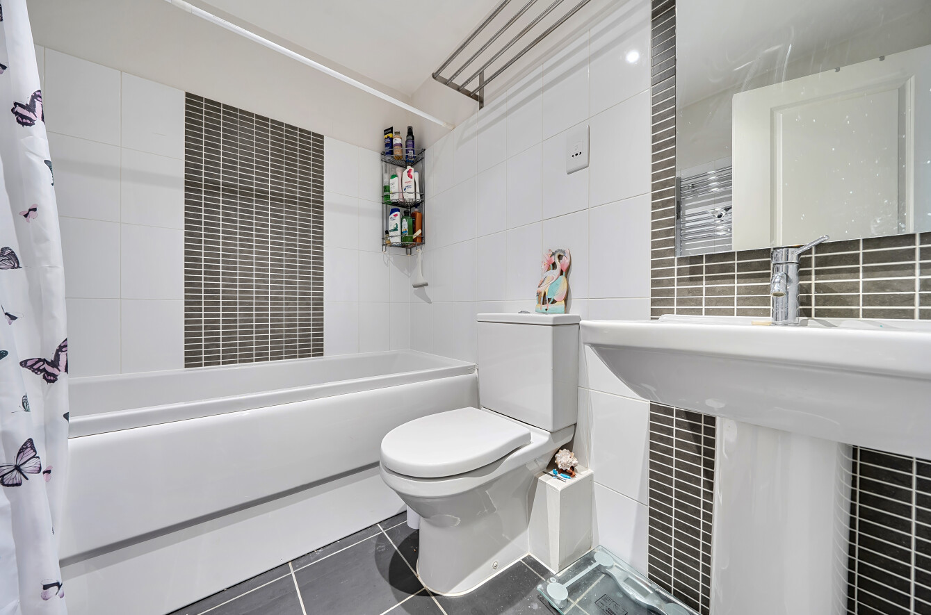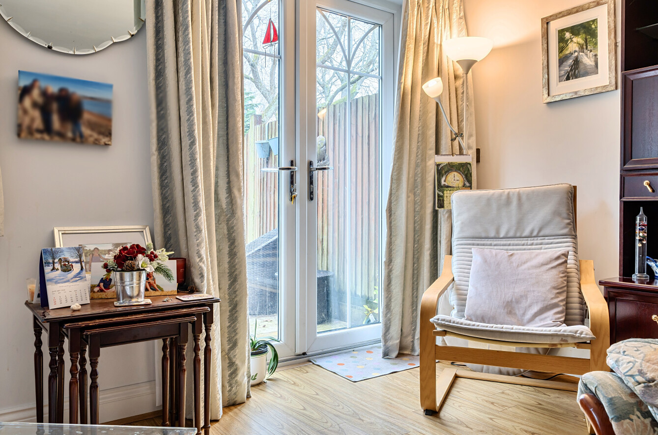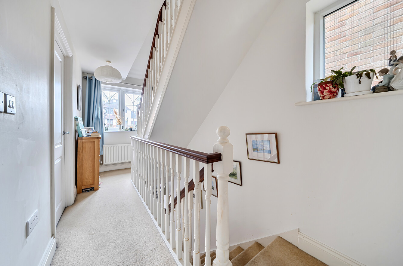 To the first floor are two well-proportioned bedrooms, both served by a family bathroom. The top floor is dedicated to the second bedroom, offering a private and flexible space ideal as a principal bedroom, guest room or home office.