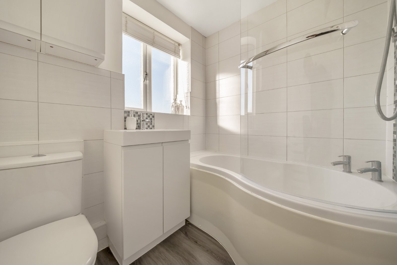 Upstairs, the property boasts two well-proportioned bedrooms, each offering a tranquil retreat with contemporary finishes. The family bathroom is elegantly designed, featuring a modern suite with a bathtub and overhead shower.