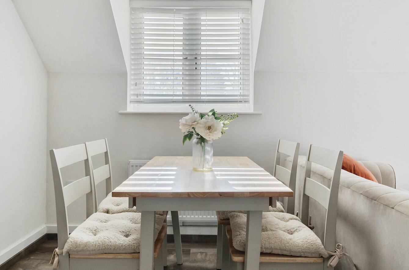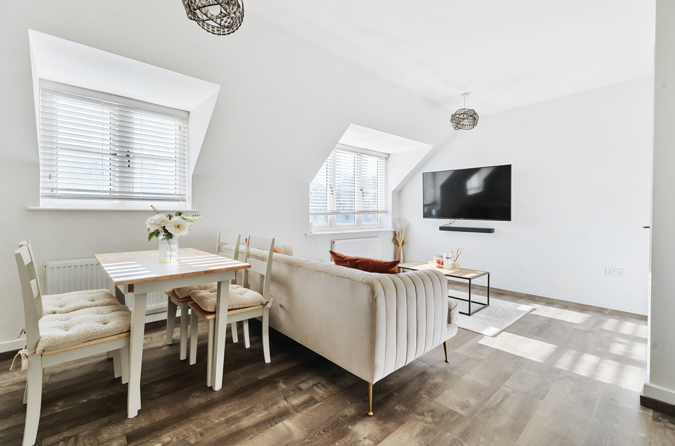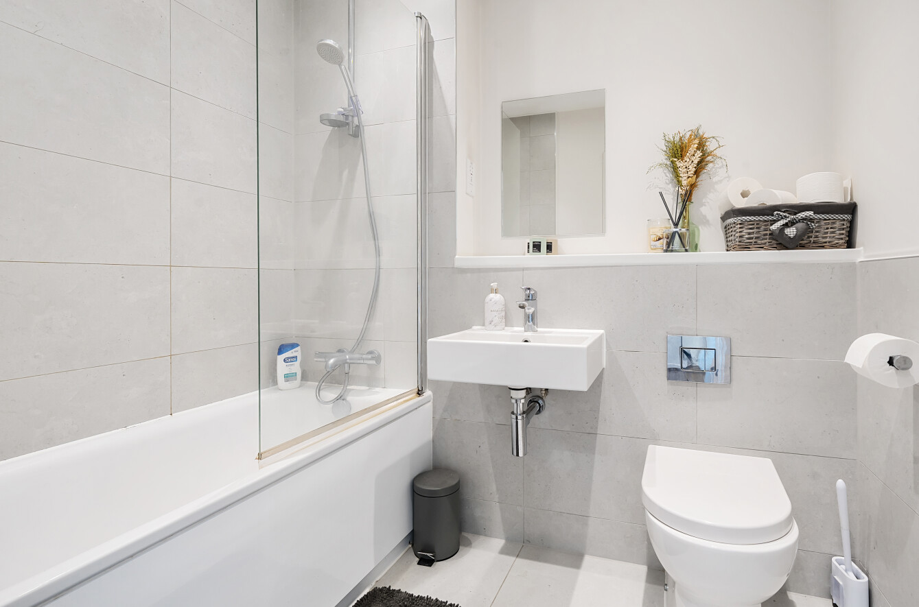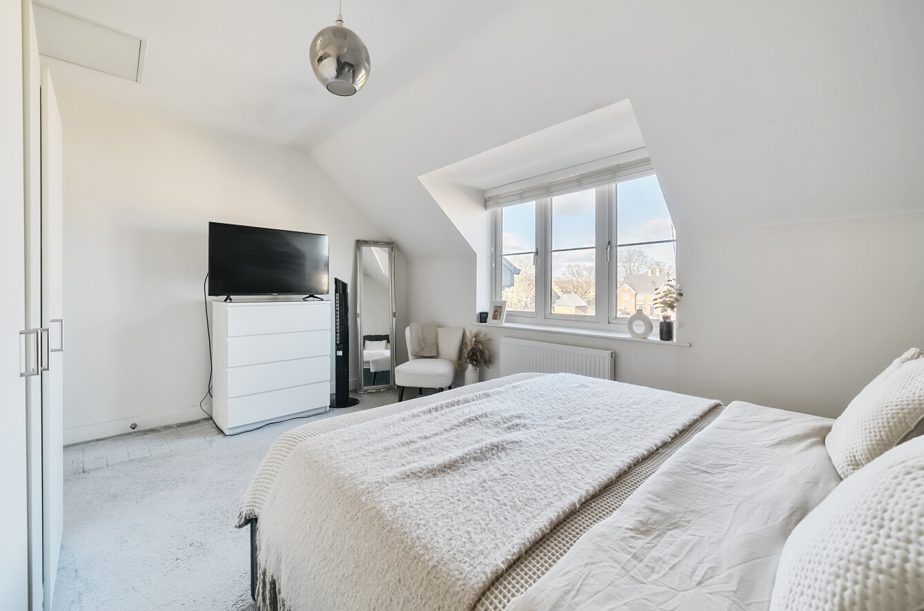 The property offers two generously sized double bedrooms, each thoughtfully designed with ample storage and charming sloped ceilings that add character to the space. The modern family bathroom is finished to a high standard, featuring a bathtub with an overhead shower, sleek tiling, and contemporary fixtures.