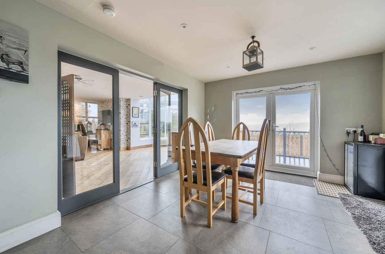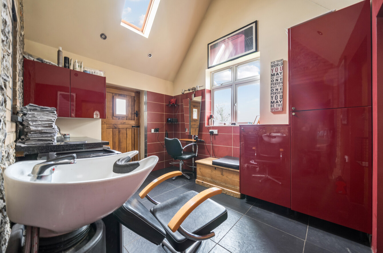 The beautifully designed kitchen/dining room features exposed beams and a striking vaulted ceiling, complemented by high-quality appliances, sleek wall and base units, and elegant work surfaces. Accessed via the dining room is the home salon and a ground floor shower room.