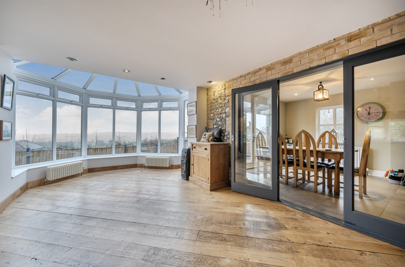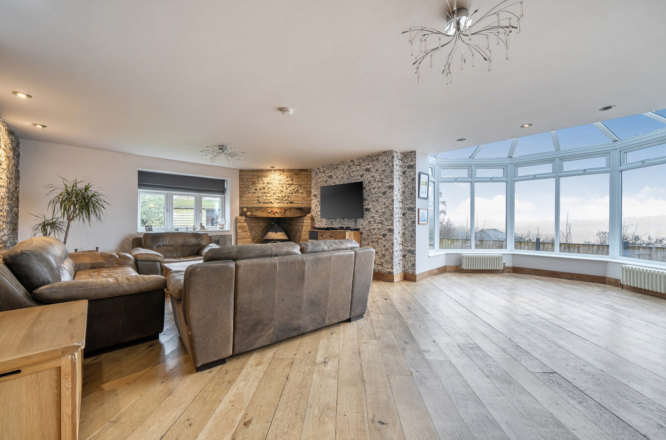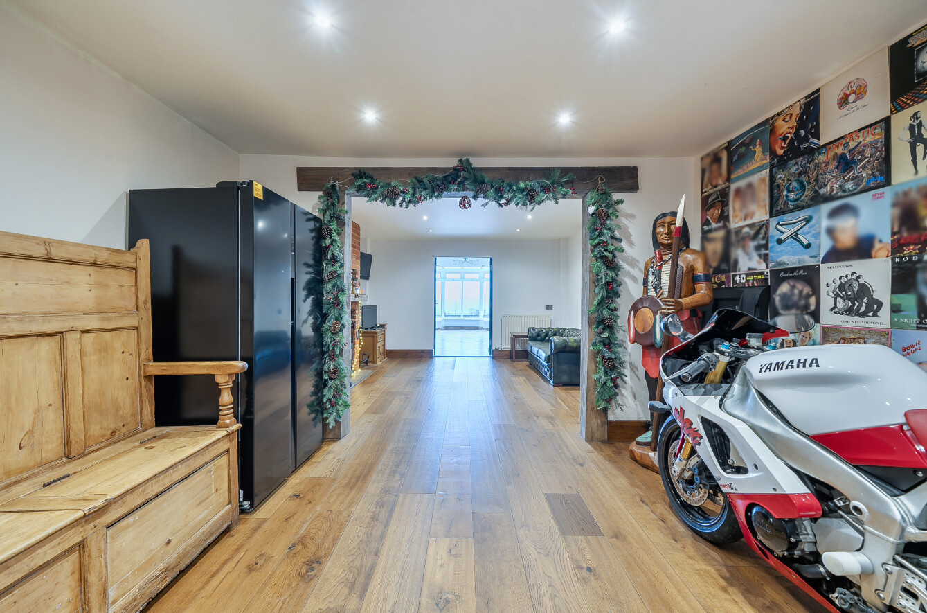 As you step inside, the entrance hall leads to the grand reception hall with a cosy log burner and opens to the warm and inviting sitting room, featuring an impressive stone fireplace with a feature wood burner. This space seamlessly flows into the sunroom, offering panoramic views of the surrounding countryside.