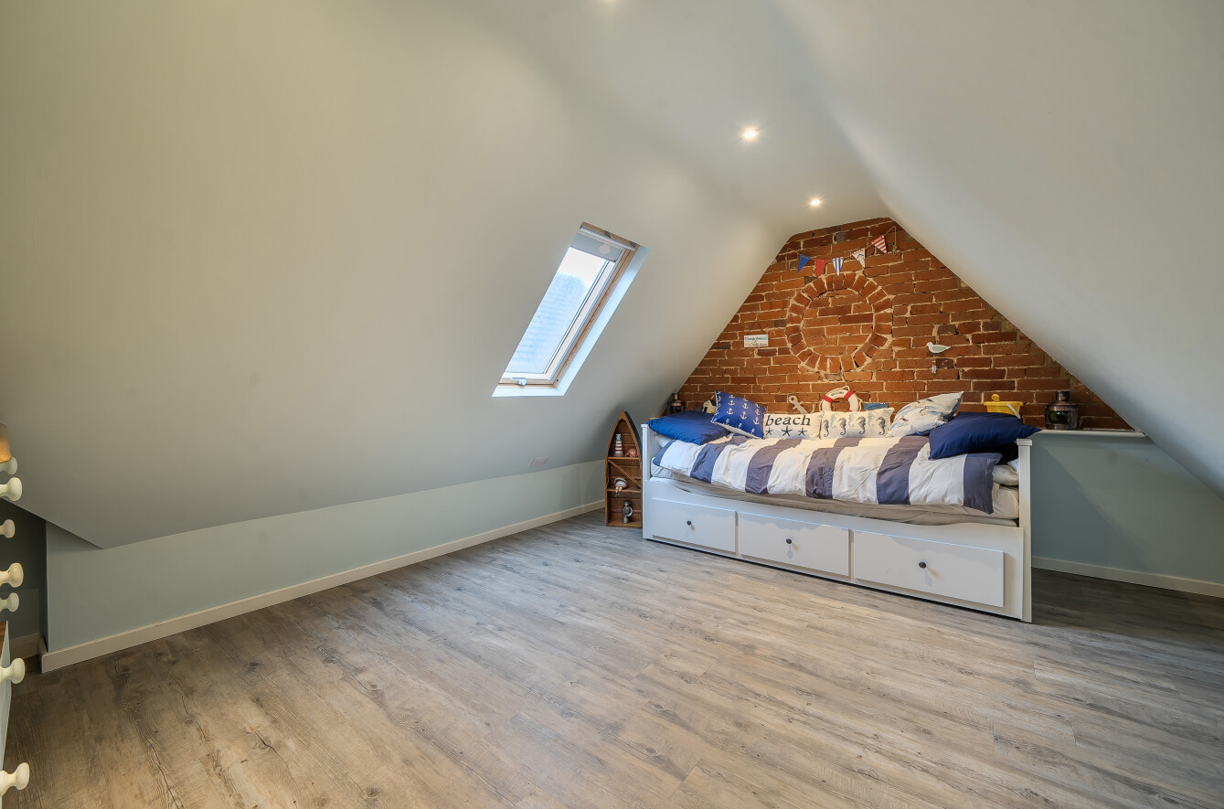 The home offers four generously sized bedrooms, each thoughtfully designed with unique character features, including exposed brickwork, vaulted ceilings, and stylish décor, two of which are conveniently located on the ground floor. The first floor bedrooms are served by a well-appointed bathroom.
