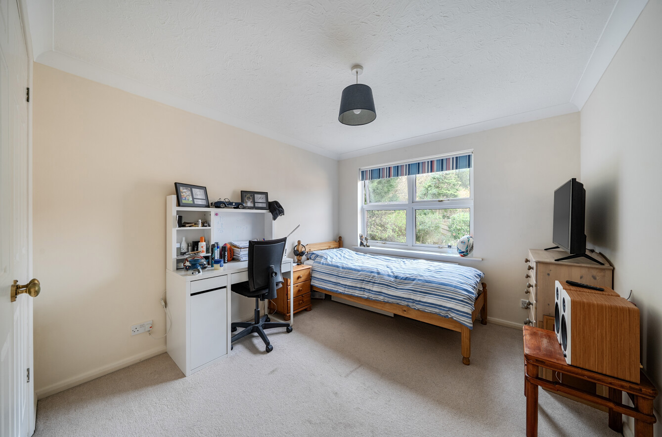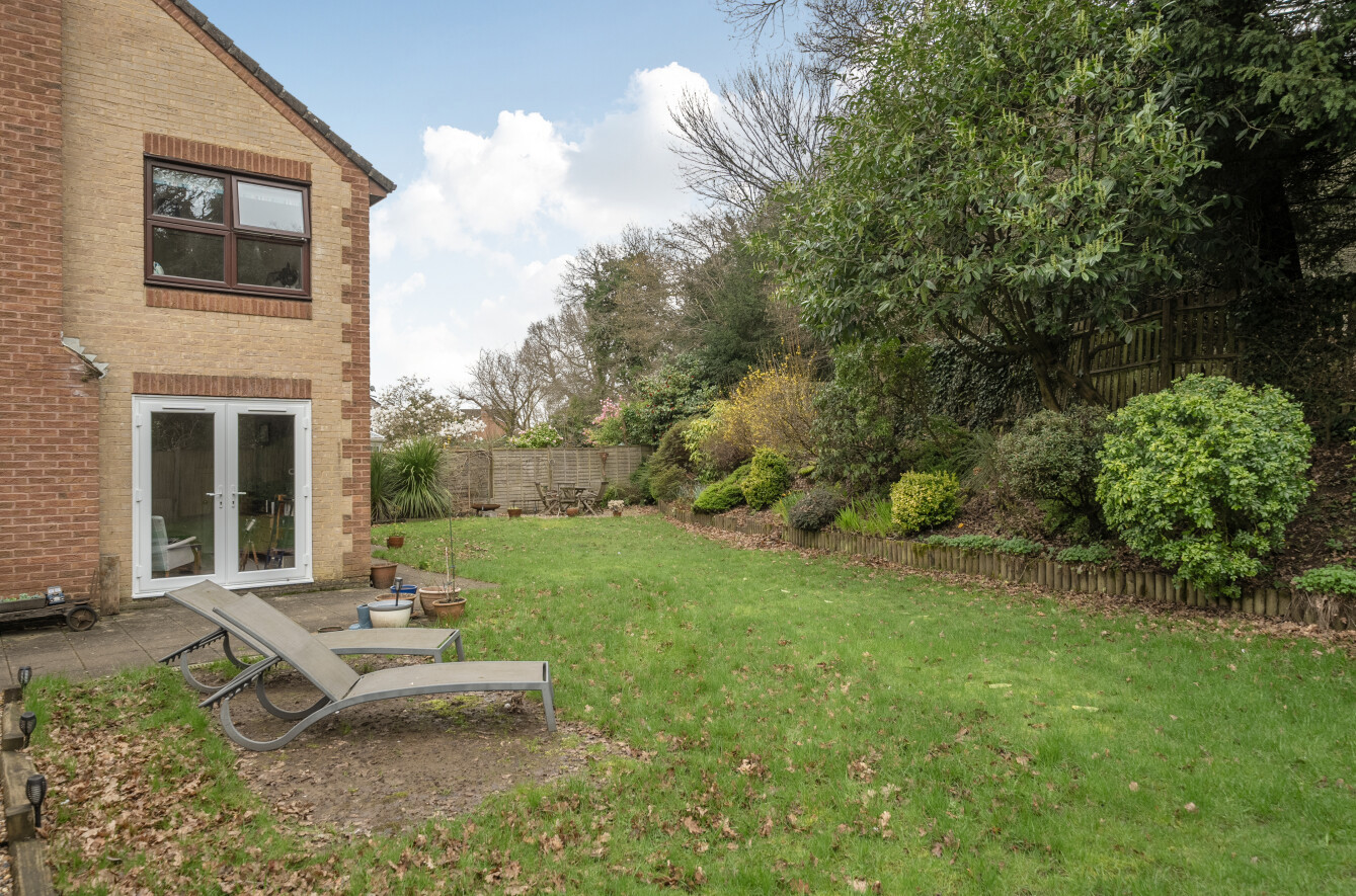 Externally, the property enjoys a south-facing rear garden which backs directly onto forestry, providing a pleasant outlook and an excellent degree of privacy. The garden offers a wonderful space for outdoor dining, relaxation, and family activities with the summer house. The property also benefits from a double garage positioned next to the house, accessed via a shared driveway, offering ample parking and storage.
