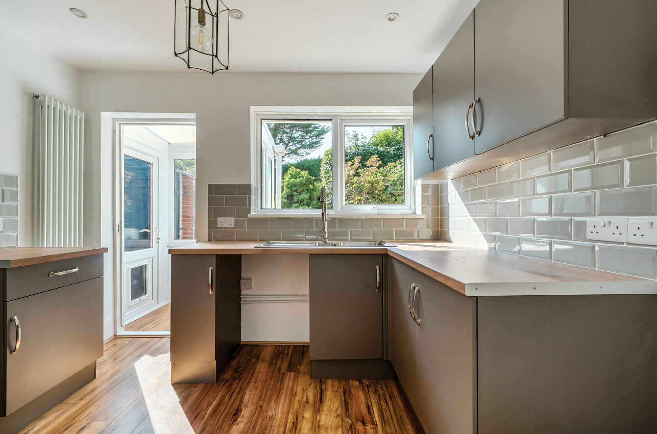 The spacious sitting room is beautifully bright, with large windows drawing in natural light and providing a welcoming hub of the home. A contemporary kitchen, fitted with stylish units and ample worktop space has direct access to the rear garden. There are two well-proportioned bedrooms and a sleek, modern family bathroom finished with a bath and overhead shower.