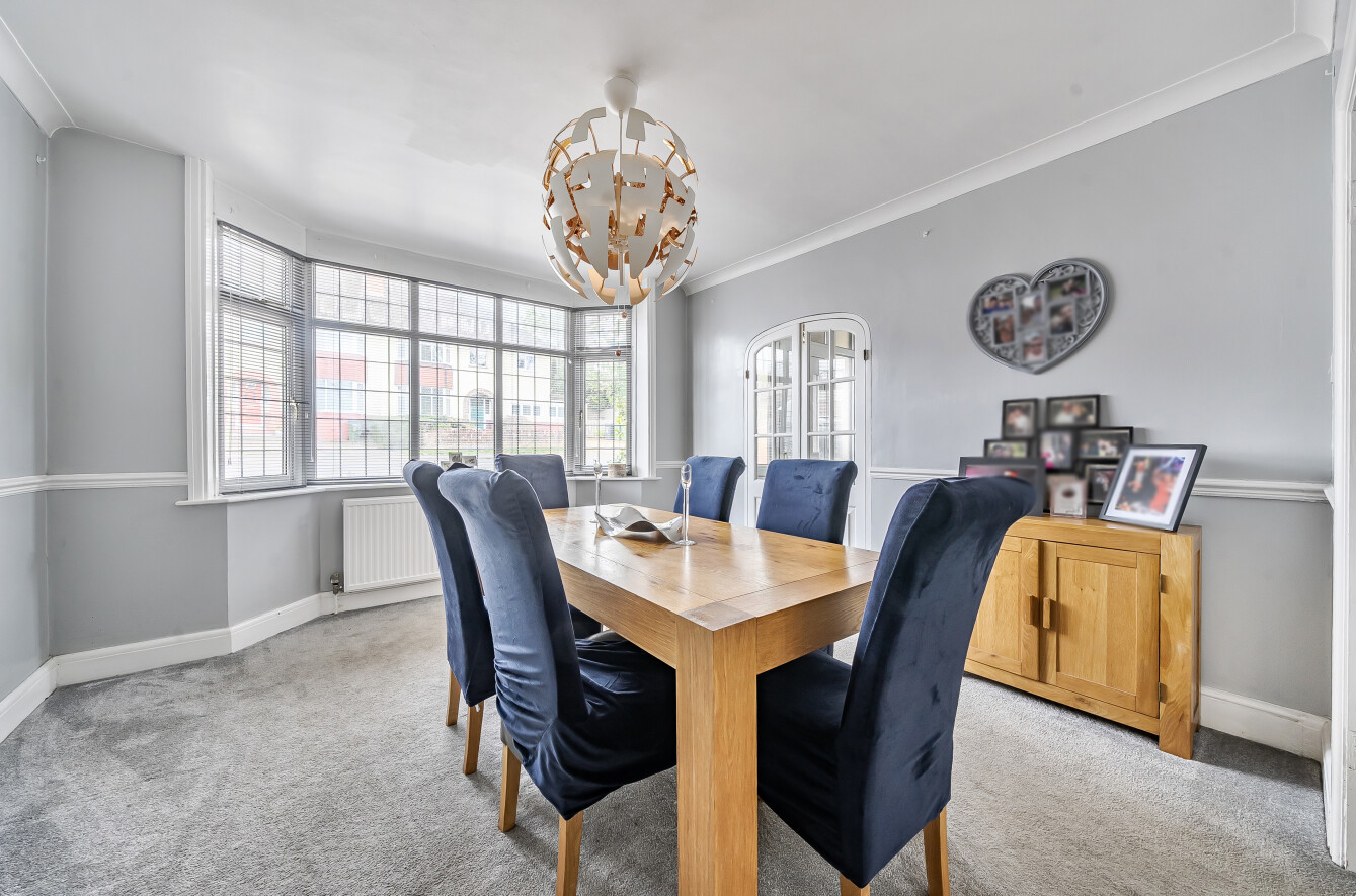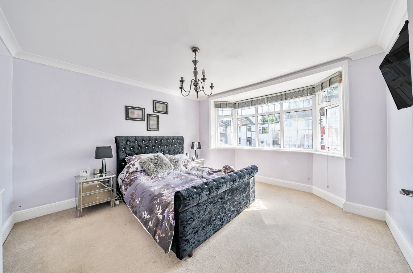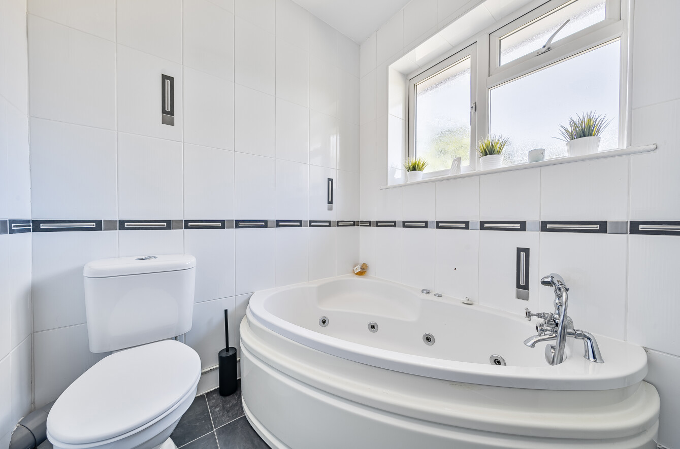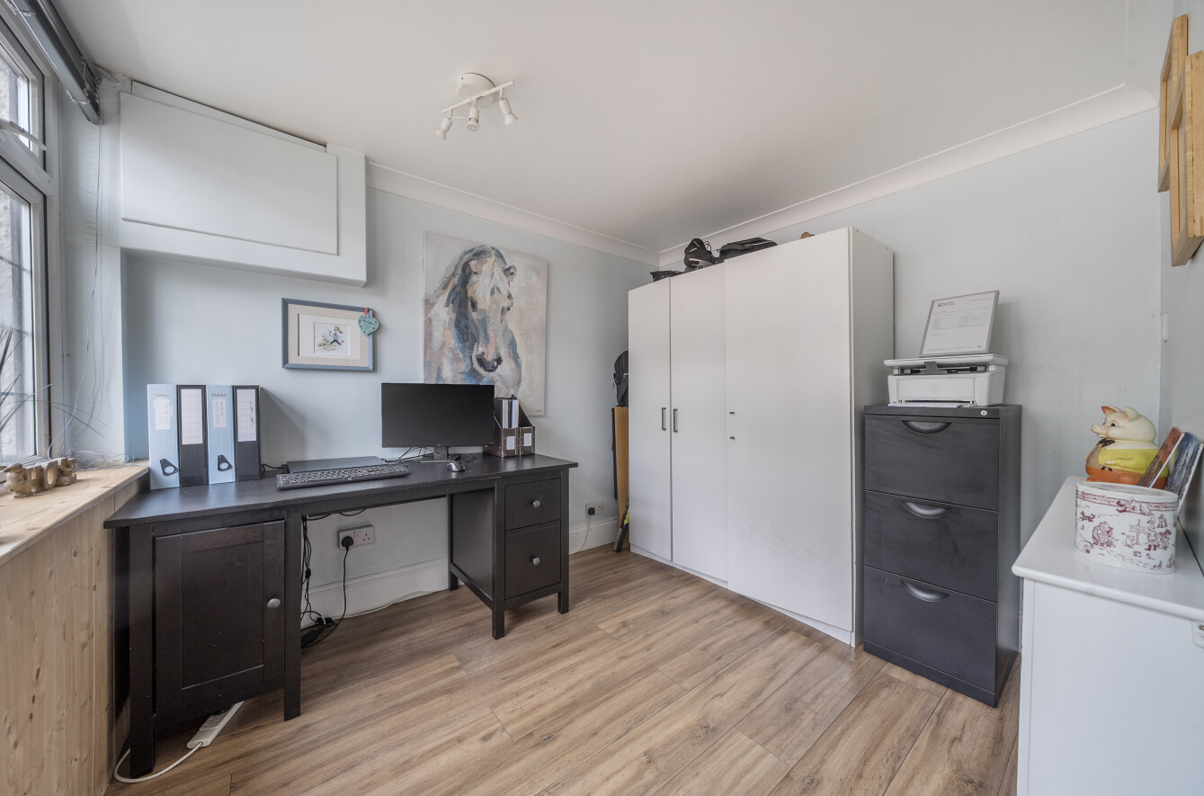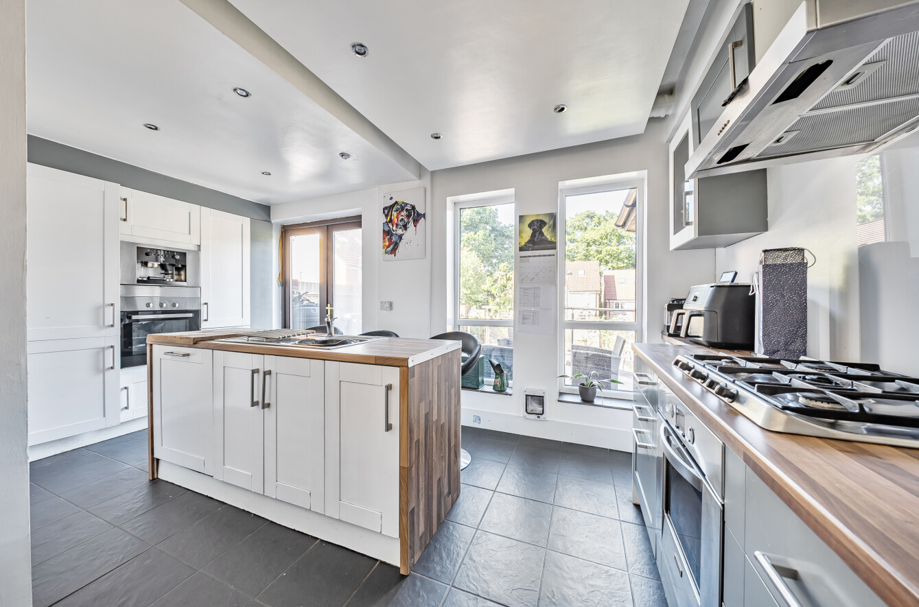 The contemporary kitchen is a highlight, complete with integrated appliances, a breakfast bar, and ample storage, with direct access to the rear garden. There is a fantastic sitting room spanning the whole length of the property, complimented with bay windows at each end. A study provides ample work from home space. Additional ground floor amenities include a utility room and a convenient cloakroom.