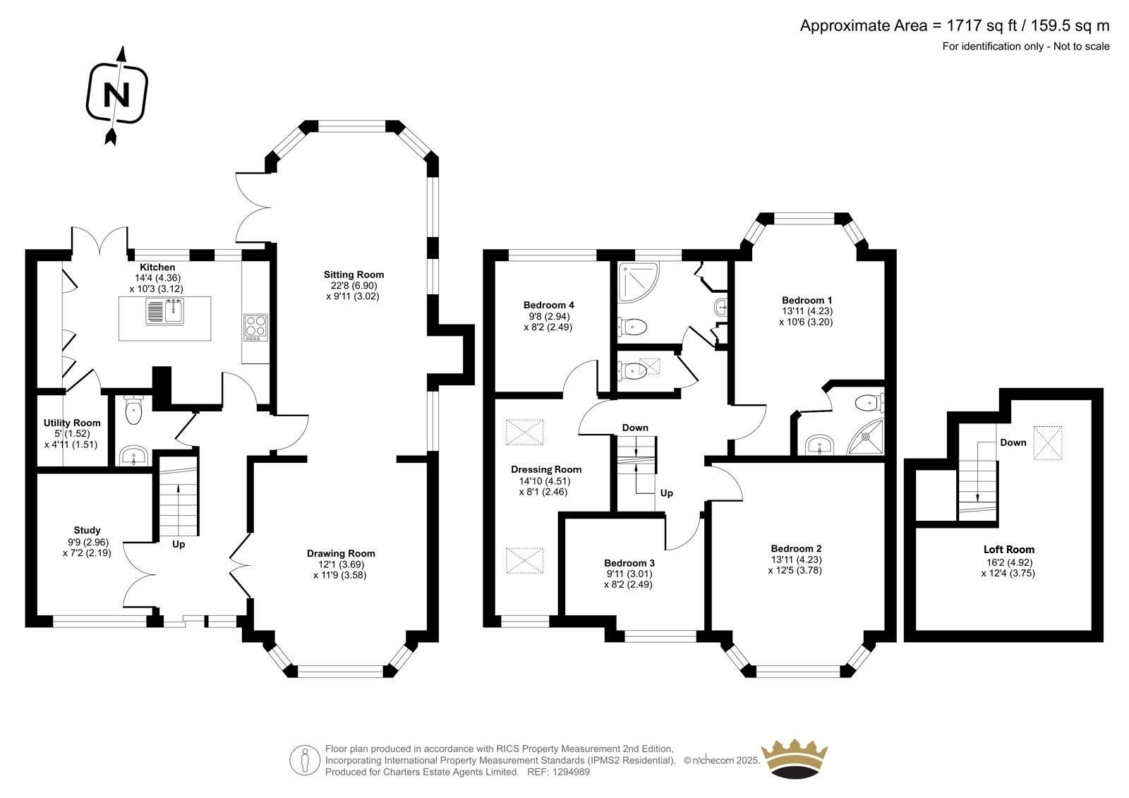 Upstairs, there are four well-sized bedrooms, including a principal room with a bay window and en-suite bathroom. A modern family bathroom boasts a luxurious corner bath, while a separate shower room adds extra convenience. A dressing room completes the first floor accommodation. Moving up a fixed wooden staircase leads to a fully carpeted loft room, perfect for storage or additional work from home space.