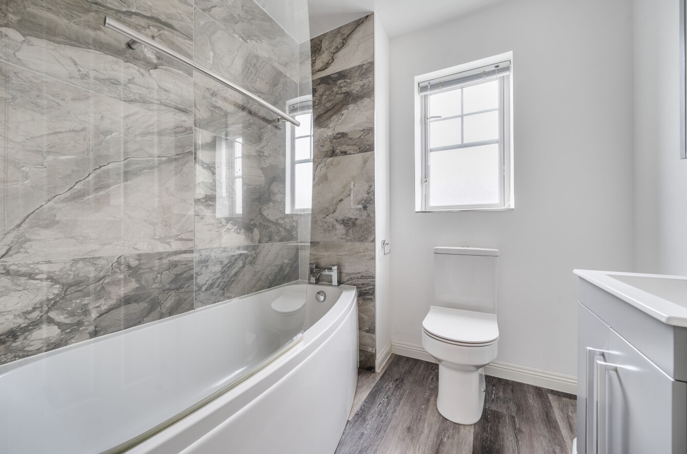 Upstairs, the property offers well-proportioned bedrooms, all freshly decorated and bathed in natural light. The principal bedroom comfortably accommodates a double bed and furniture, while the additional bedrooms provide excellent flexibility for children, guests or home working. The family bathroom is finished to a high standard with modern fixtures and a clean, contemporary style.