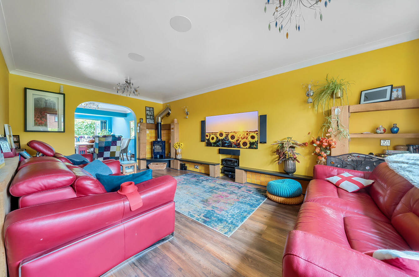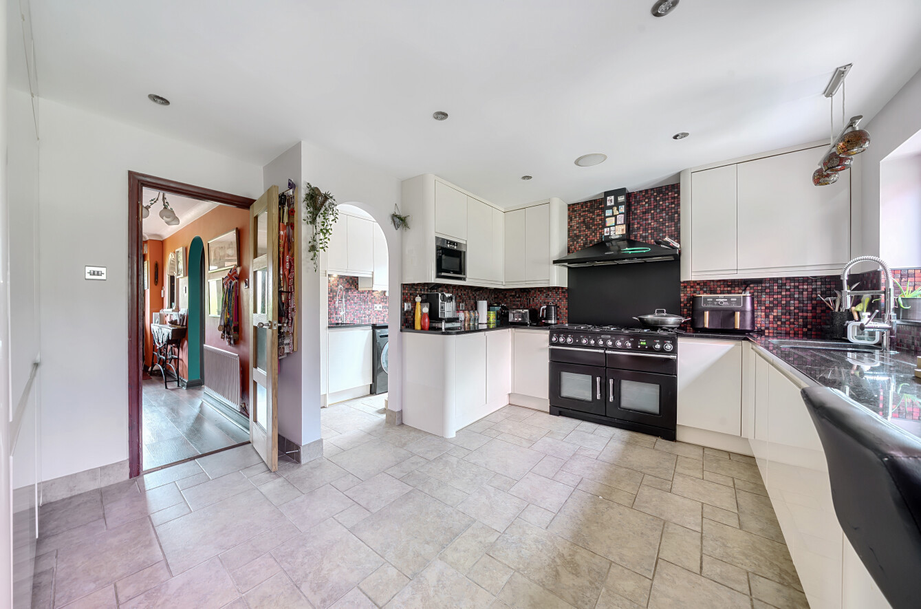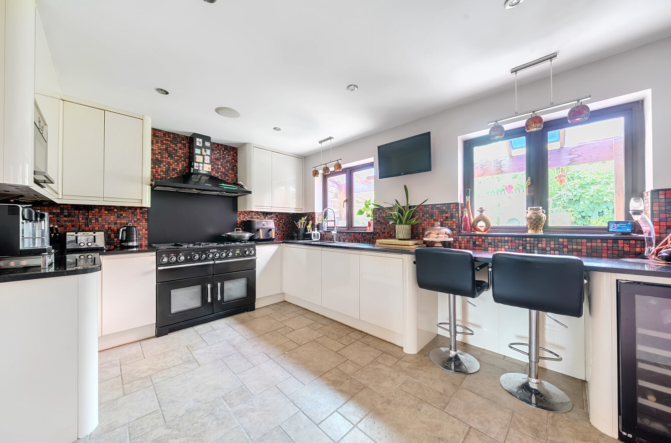 A second reception room provides additional flexibility as a family room or home office, while the separate dining room with garden access creates the perfect setting for entertaining. The kitchen is fitted with ample storage, work surfaces, and breakfast bar seating, complemented by a separate utility space and shower room.