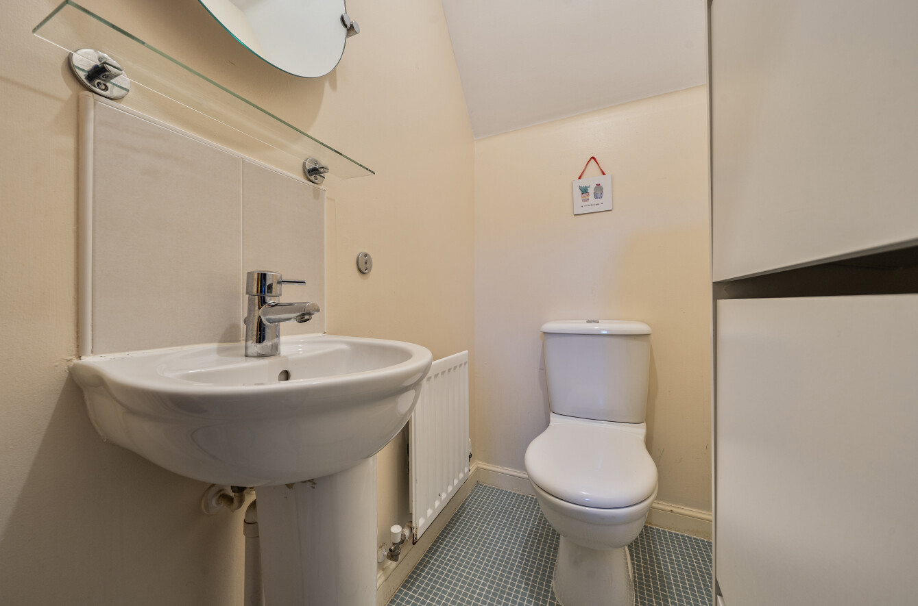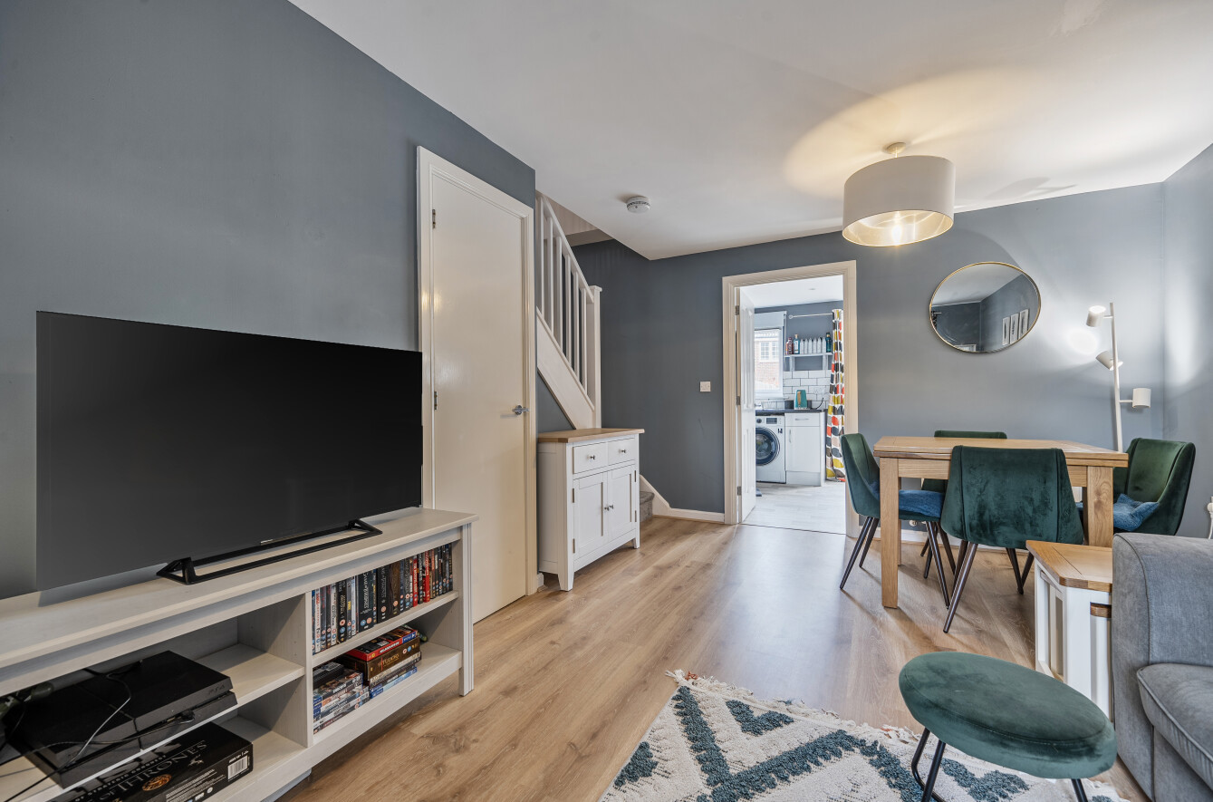 The ground floor comprises a welcoming entrance hall and a contemporary kitchen fitted with a range of modern units and work surfaces, with French doors opening directly onto the rear garden. There is also a well proportioned open-plan sitting and dining area towards the front, creating an excellent space for everyday living and entertaining. A downstairs cloakroom/WC completes the ground floor.