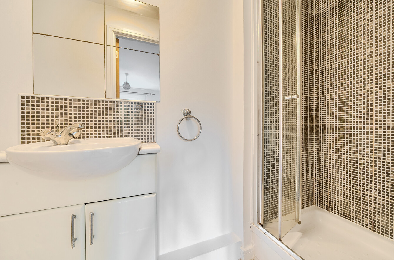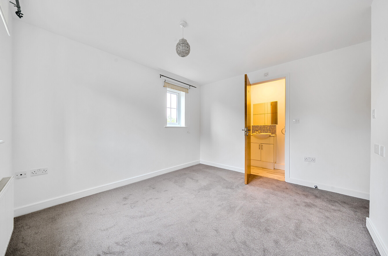 There are two well-proportioned bedrooms, including a generous principal bedroom with an en-suite shower room, complemented by a modern family bathroom fitted with a white suite and tasteful finishes.