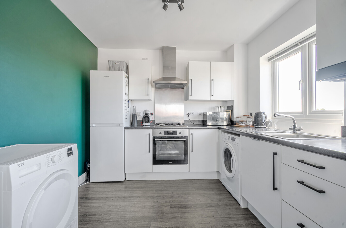 The kitchen is well-appointed, offering generous worktop and storage space, ideal for everything from quick weekday meals to more elaborate weekend cooking.