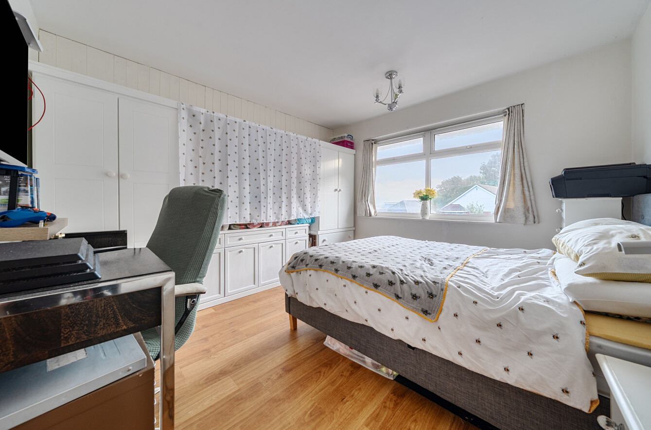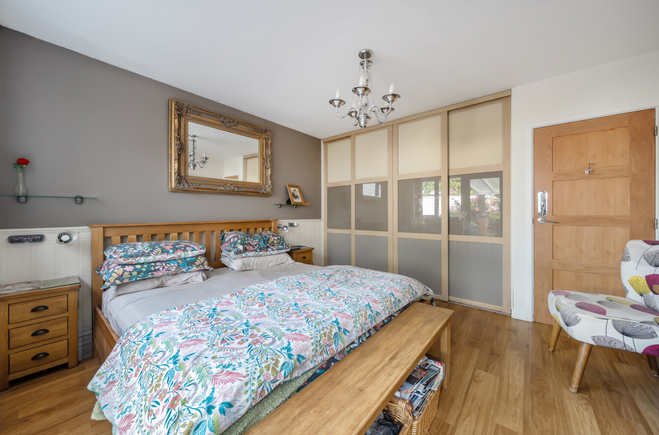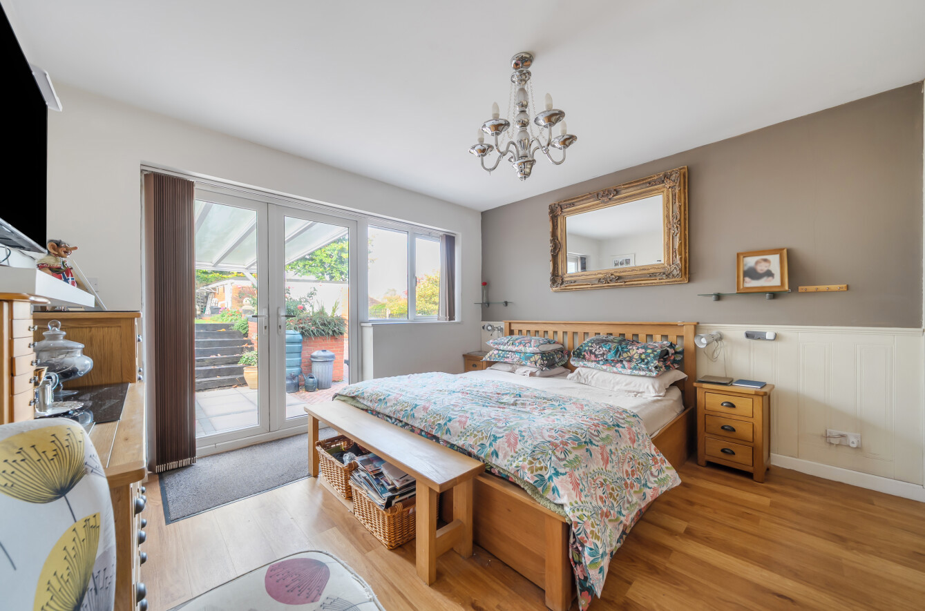 The property features four generous double bedrooms, including a luxurious principal suite with an en-suite bathroom, walk-in wardrobes, and French doors opening directly onto the garden. A second double bedroom is located on the ground floor, providing ideal flexibility for guests, multigenerational living, or a home office.