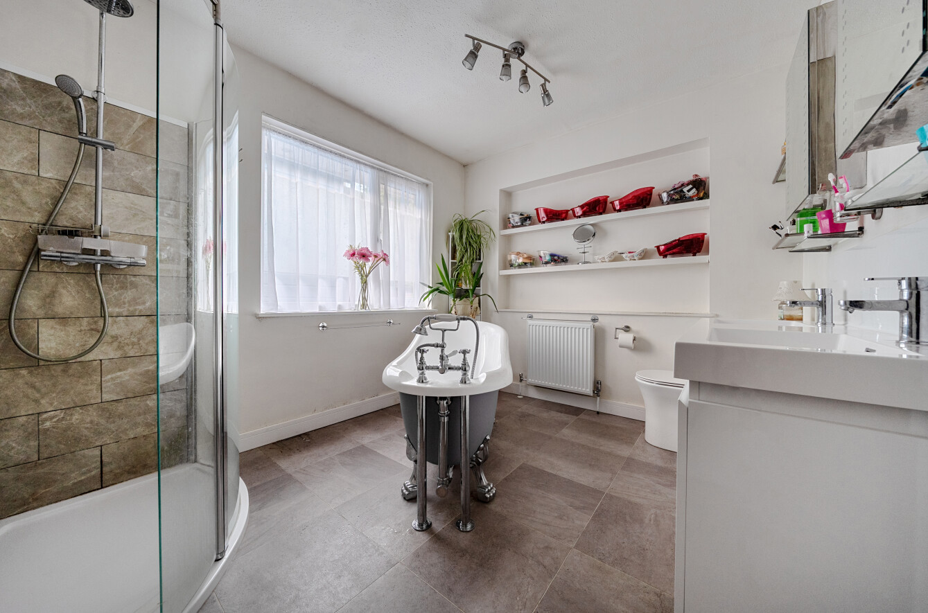 The home offers a beautifully appointed main bathroom featuring a free-standing bath, separate shower cubicle, and heated towel rail — creating a spa-like retreat. The en-suite off the principal bedroom adds further comfort and privacy, while an additional toilet is conveniently located in the large summer house in the garden.