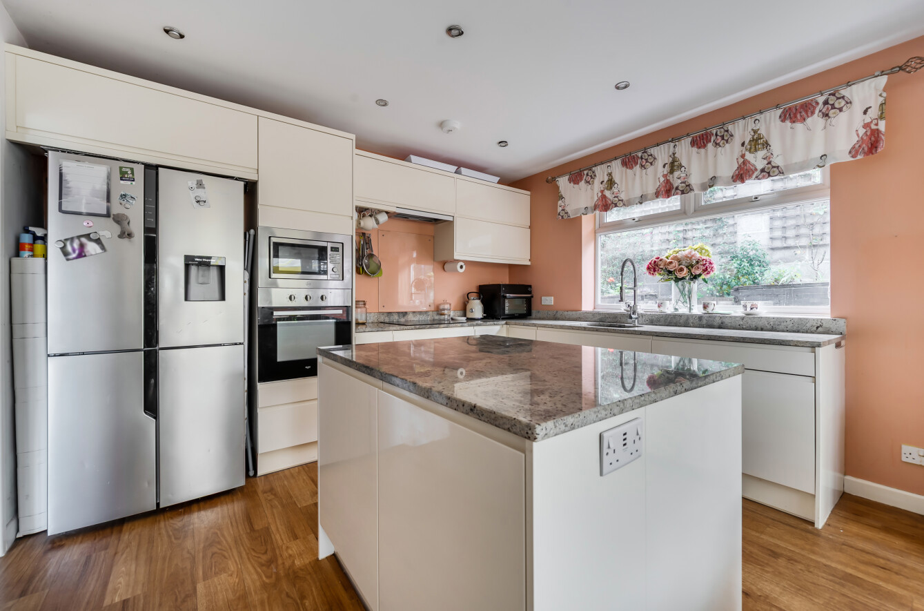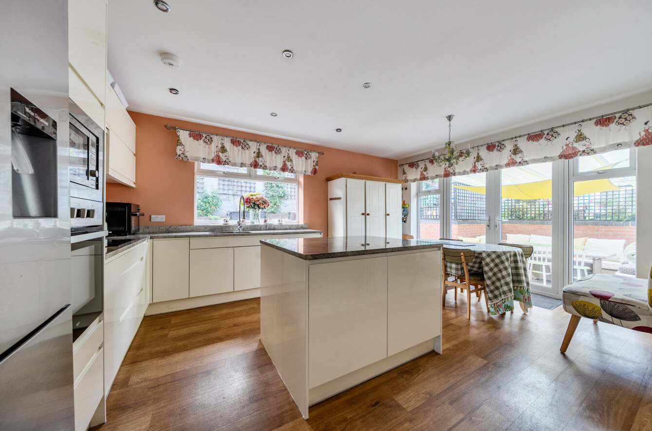 At the heart of the home lies a bright, contemporary kitchen with a central island, built-in appliances, dining area, and a useful utility space. Double doors open onto the garden, promoting a seamless indoor–outdoor living experience.