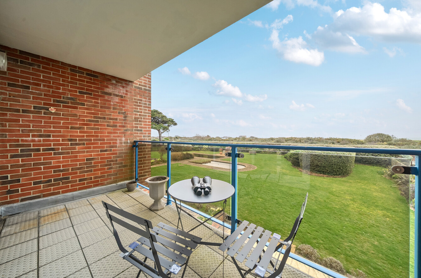 The bright and expansive living area features large windows and a private balcony that frame the spectacular sea views, creating a perfect space to relax or entertain. The well-equipped kitchen provides ample storage and workspace, complementing the practical and stylish layout. All three bedrooms are generously proportioned, including a principal suite with a modern en-suite shower room.