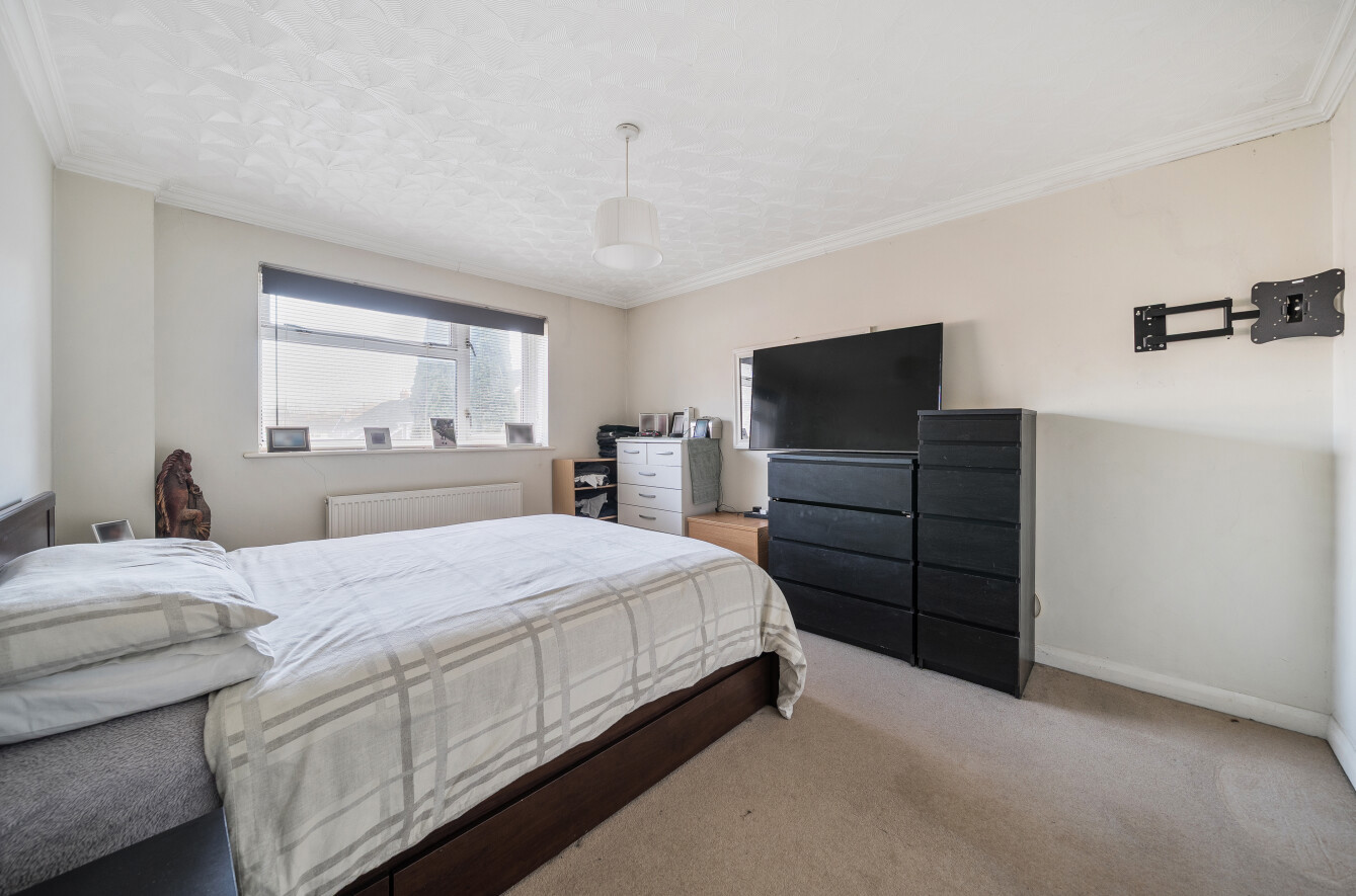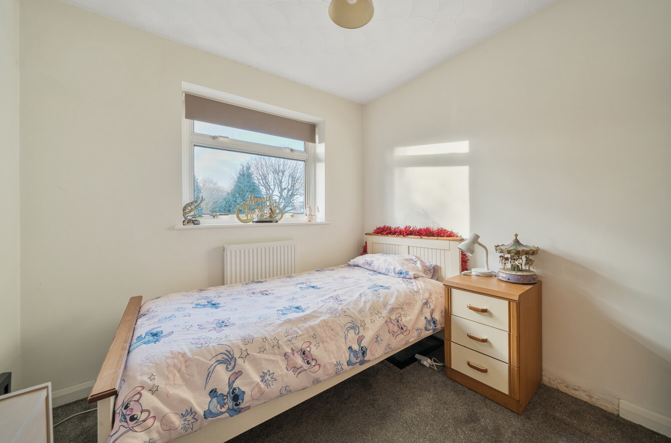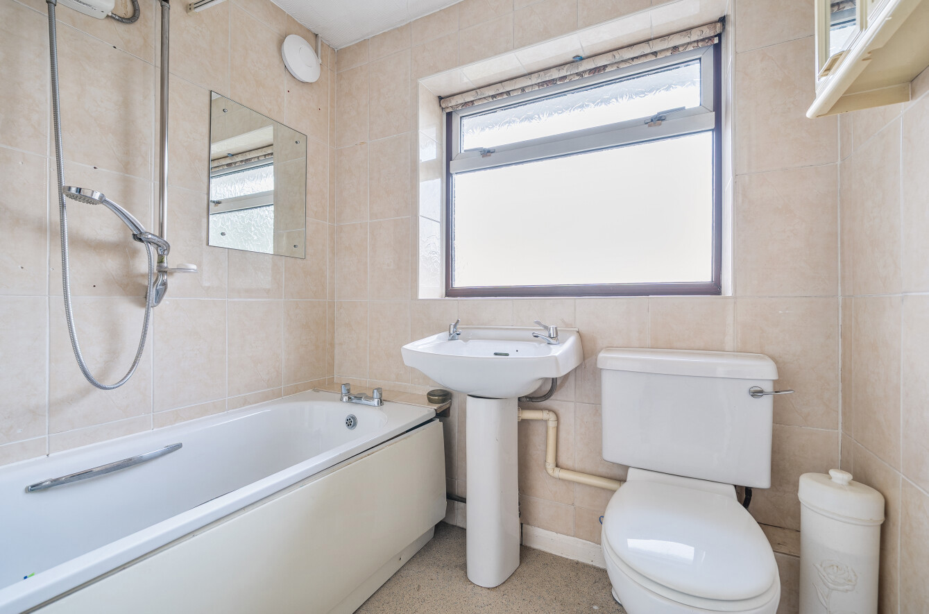 Upstairs, the home offers three well-proportioned bedrooms. The principal and second bedrooms are generous doubles, while the third bedroom is a comfortable single or ideal home office. The family bathroom is fitted with a full white suite including bathtub with shower over, complemented by neutral tiling.