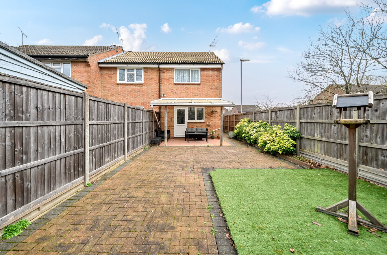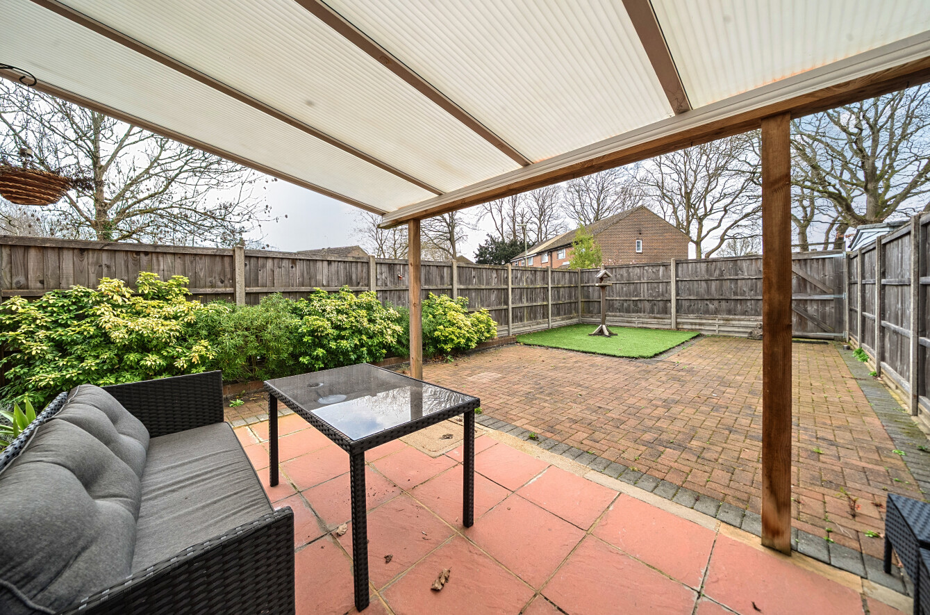 Upstairs, the property offers two well-proportioned bedrooms, ensuring flexibility to provide guest accommodation or a home office. A family bathroom completes the first-floor accommodation. Externally, the rear garden is generous in size and has been designed with low maintenance in mind, featuring a patio area ideal for outdoor seating and an artificially turfed section beyond. A covered seating area provides a sheltered space for relaxing or entertaining throughout the year.