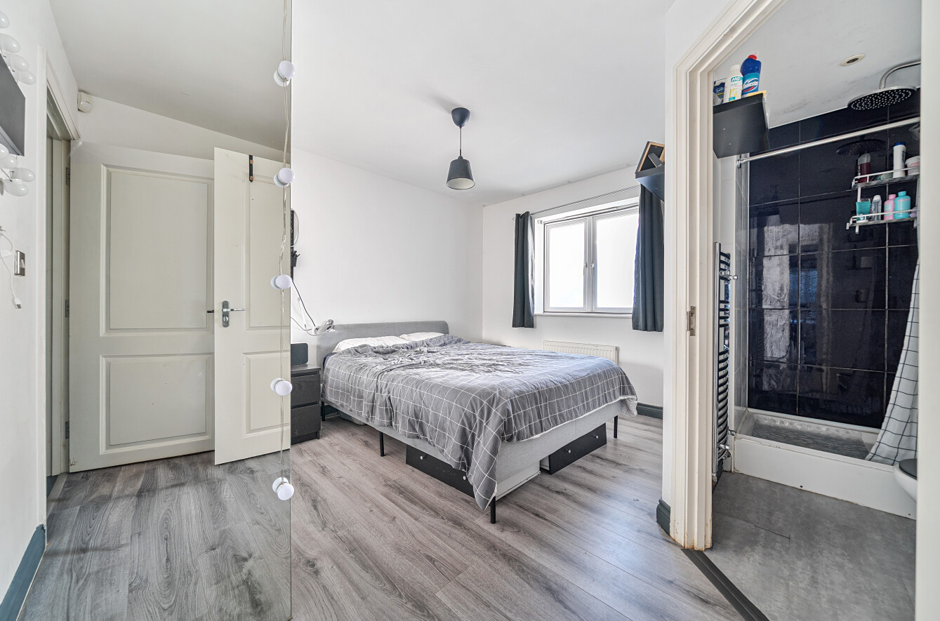 The sitting area flows seamlessly into a modern fitted kitchen, creating an excellent space for both day-to-day living and entertaining. The kitchen is appointed with a range of sleek units, ample work surface space and integrated appliances. There are two well-proportioned bedrooms, including a generous principal bedroom benefitting from a sleek ensuite shower room and a second bedroom ideal as a guest room, nursery or home office. The property is served by a modern bathroom fitted with a white suite.