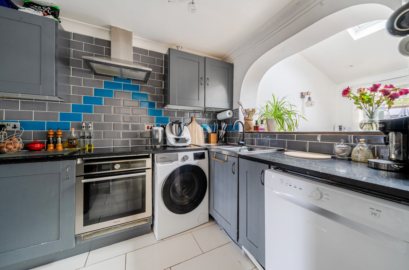 To the rear, the property opens into a stunning open-plan kitchen, dining and lounge area, truly the heart of the home. This spacious and sociable setting is enhanced by striking Velux windows that flood the room with natural light, creating an airy and uplifting atmosphere throughout the day. The kitchen is perfectly positioned for both everyday living and entertaining, while the dining and lounge areas provide ample space for family gatherings and hosting guests. Double doors lead directly from the lounge onto the garden, seamlessly connecting indoor and outdoor living.