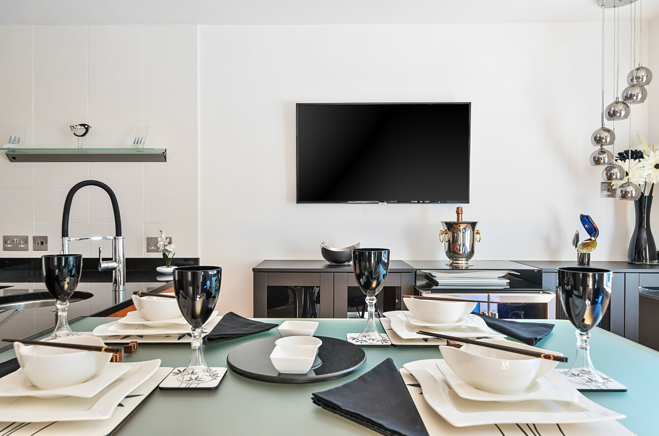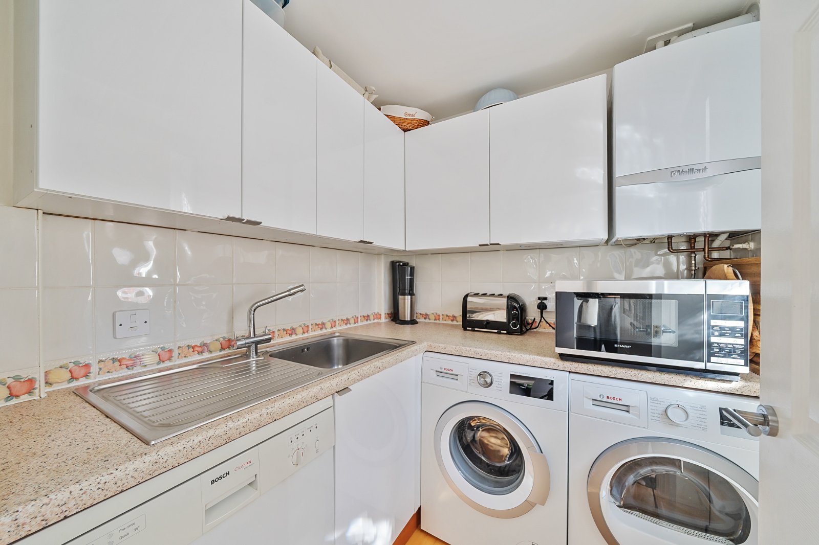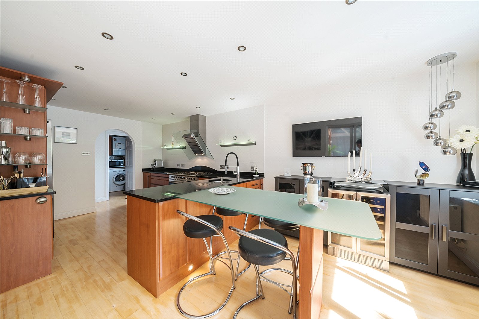 The fully fitted kitchen offers an array of quality built-in appliances, a sleek range of wall, base and drawer units with black granite worktops. The kitchen encompasses an additional dining area with a customised glass Breakfast Bar and a window to the garden overlooking the swimming pool. Complementing the kitchen is a separate laundry room with wall units, sink, space for washing machine, tumble drier and an additional dishwasher or fridge.