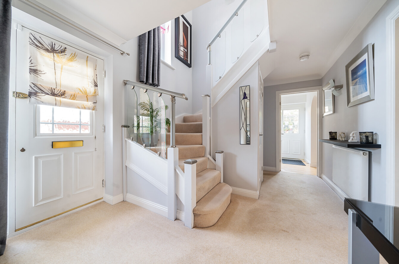 Upon entering the property you are greeted by a large entrance hallway with contemporary glass staircase. Double glass doors lead through to a spacious sitting room, boasting a beautiful bay window, feature fireplace, and a chimney—offering the potential to install a log burner for added warmth and character.