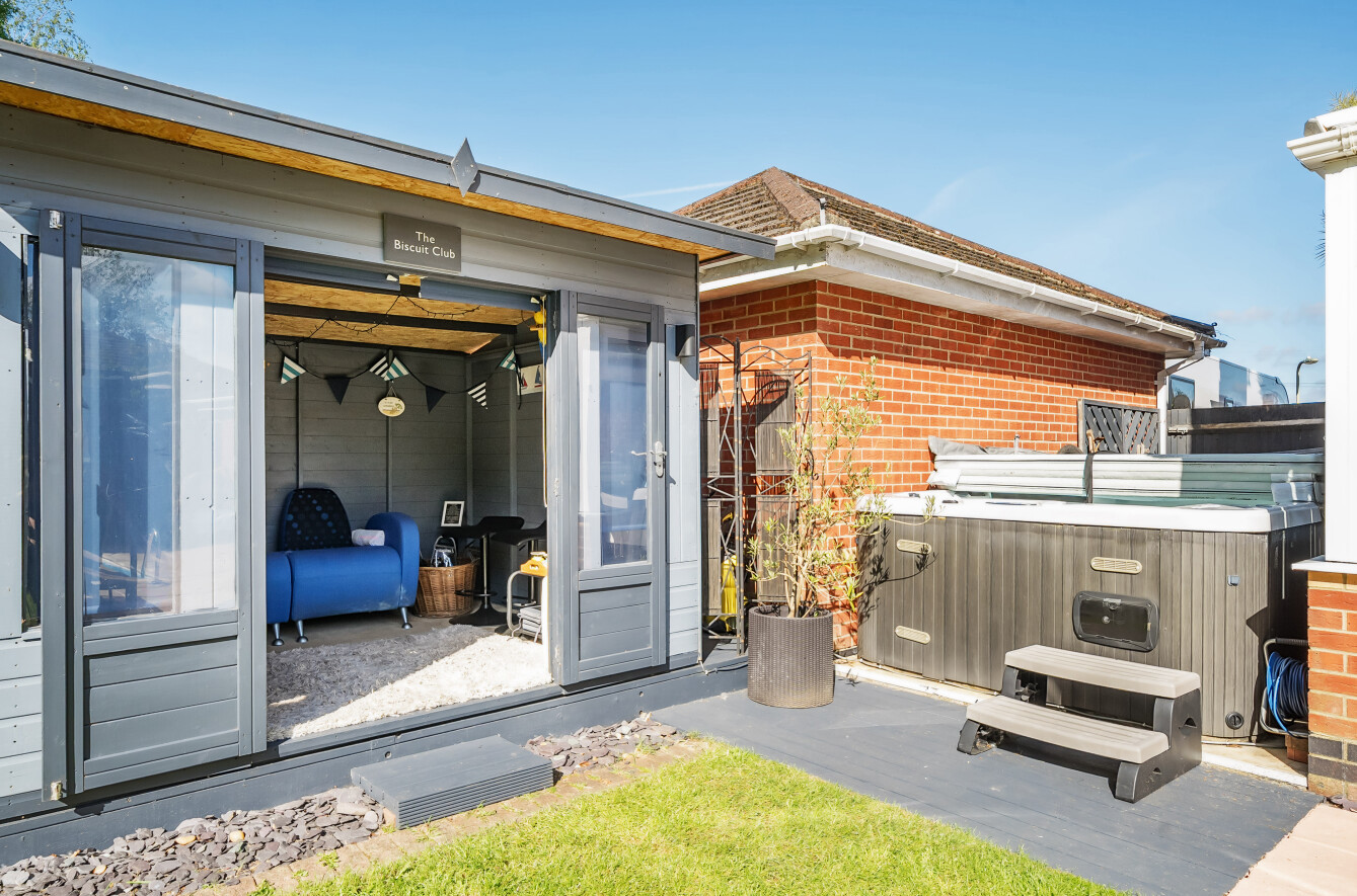 The Summer House is 10 ft x 10 ft approx, has power, is an ideal playroom/ games room/ Gym / home office.