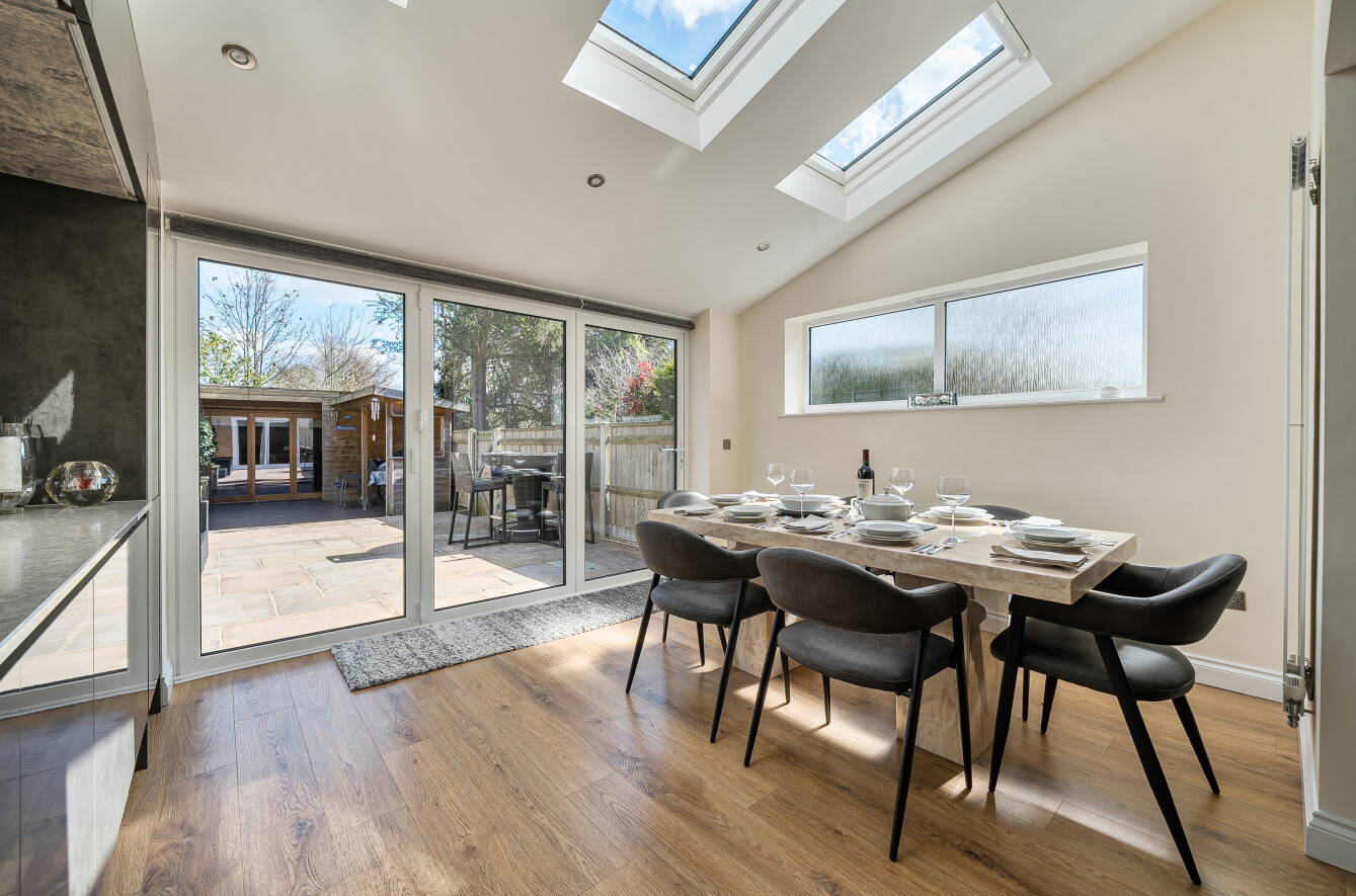To the rear, the property truly shines with a beautifully executed extension that creates an impressive dining area overlooking the garden. Thoughtfully designed and finished to a high standard, this stunning addition enhances the flow of the home while allowing natural light to pour in, creating a warm and inviting atmosphere. The extension forms the heart of the property, perfect for family meals, social gatherings, or simply enjoying the outlook onto the garden.