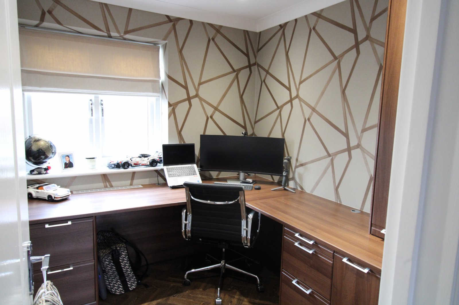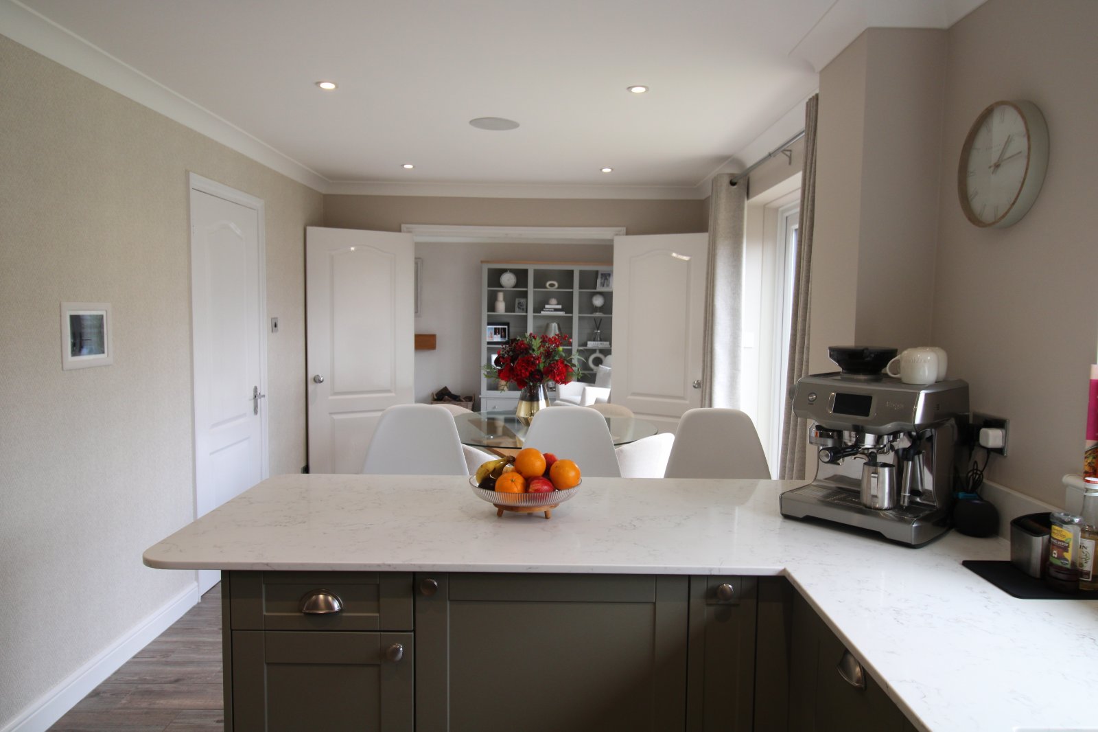 The ground floor features a bright sitting room with bay window, while the impressive kitchen/dining room forms the heart of the home. Recently updated with a Wren kitchen, quartz worktops, Neff appliances, induction hob, and Grohe ‘Blue’ filtered tap, it is ideal for both family life and entertaining. An integrated Sonos sound system, separate utility room, cloakroom, and a premium fitted home office with Karndean flooring further enhance the space. A double garage with electric roller door provides excellent storage and parking.