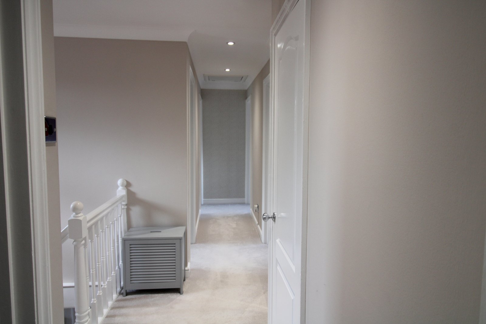 Upstairs are five well-proportioned bedrooms, three with fitted wardrobes, alongside a modern family bathroom with Porcelanosa tiling and an additional shower room.
