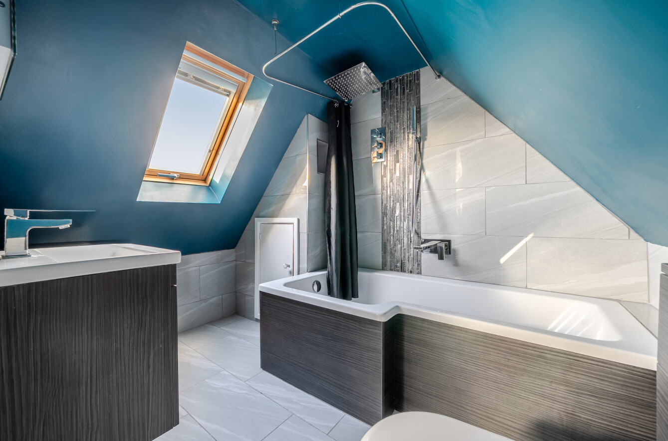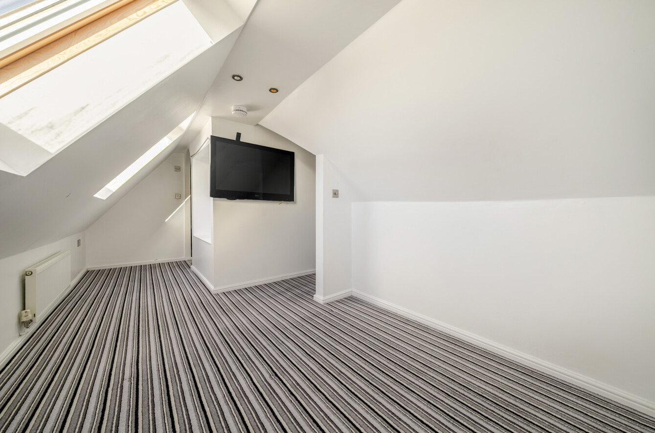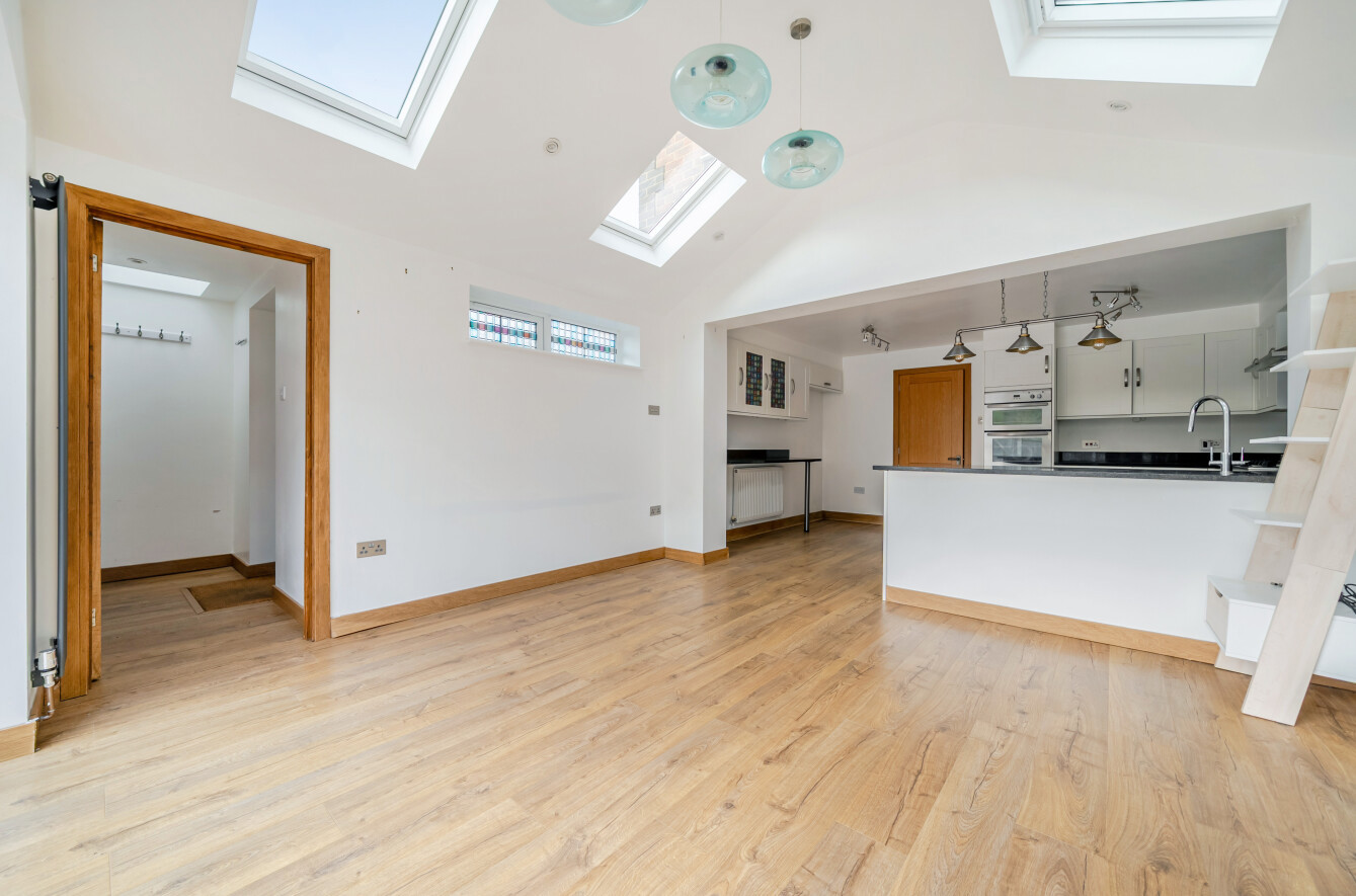 The real heart of the home is the impressive extended kitchen/dining area at the rear. Thoughtfully designed by the current owners, this space is flooded with natural light, thanks to the addition of Velux windows in the vaulted ceiling. The modern kitchen boasts a range of sleek cabinetry, ample worktop space, and high-quality integrated appliances, making it both stylish and functional. The open-plan design ensures a fantastic space for family meals and entertaining guests.
