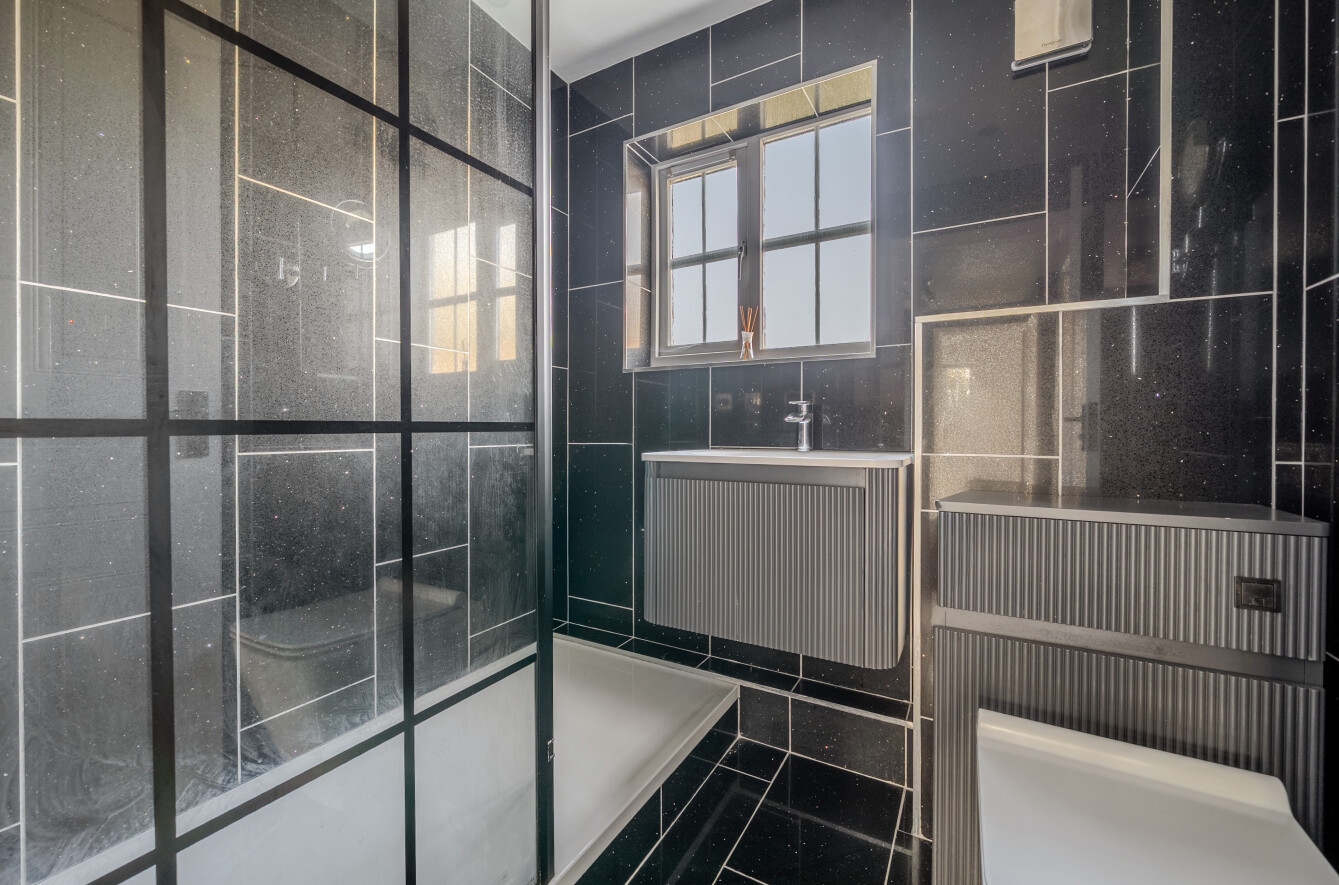 The first floor accommodates three well-proportioned bedrooms, each offering flexibility for use as children’s rooms, guest accommodation, or home office space. These bedrooms are all served by the modern family bathroom, complete with a double shower, WC, and hand basin.
