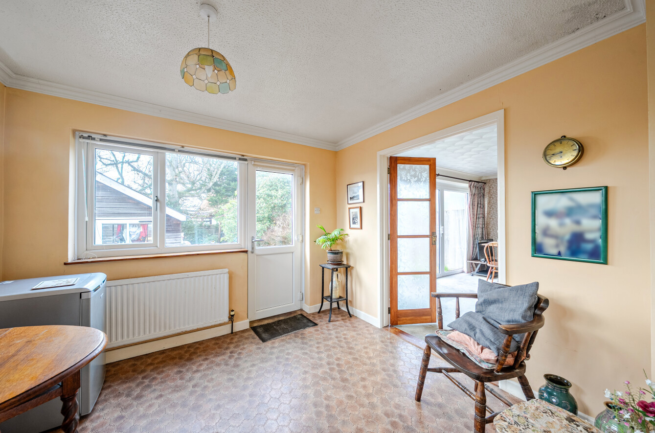 The accommodation is arranged on a single level and comprises a generous sitting room, a kitchen which flows into a dining area, three bedrooms, and a family bathroom. The layout is practical and well proportioned, providing a solid foundation for a comfortable home. The property offers a clear sense of space and versatility, allowing buyers to adapt the accommodation to suit their lifestyle over time.