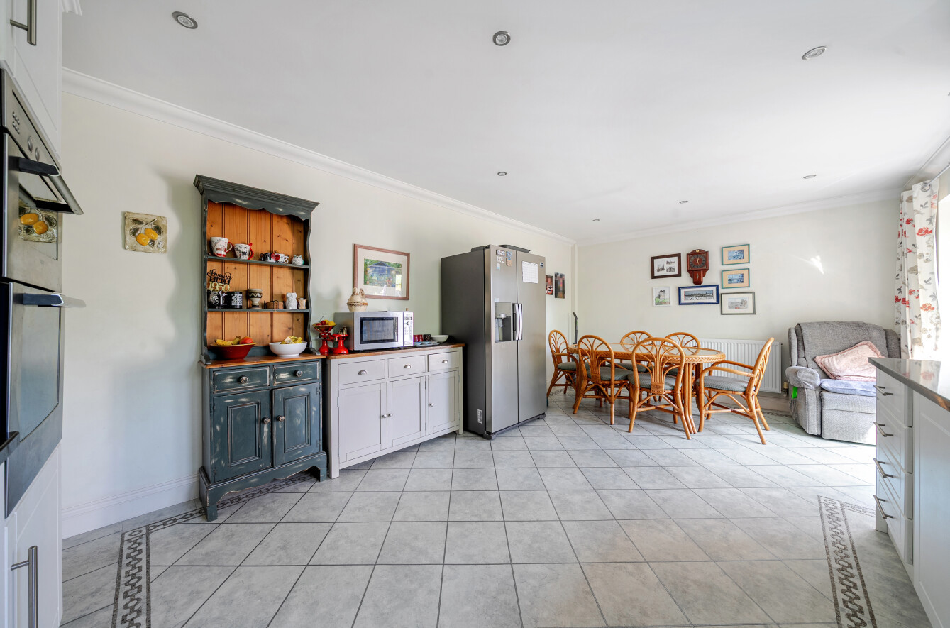 A welcoming entrance hall leads to the principal rooms. To the front of the property, the spacious sitting room boasts a charming bay window that floods the space with natural light, providing a cosy yet elegant setting for relaxation. At the heart of the home is the expansive kitchen/dining room — a superb space designed for modern family living. Featuring sleek cabinetry, ample work surfaces, and French doors opening directly onto the garden, it is perfect for both everyday meals and entertaining. A useful utility room, conveniently located off the kitchen, offers additional storage and laundry facilities.