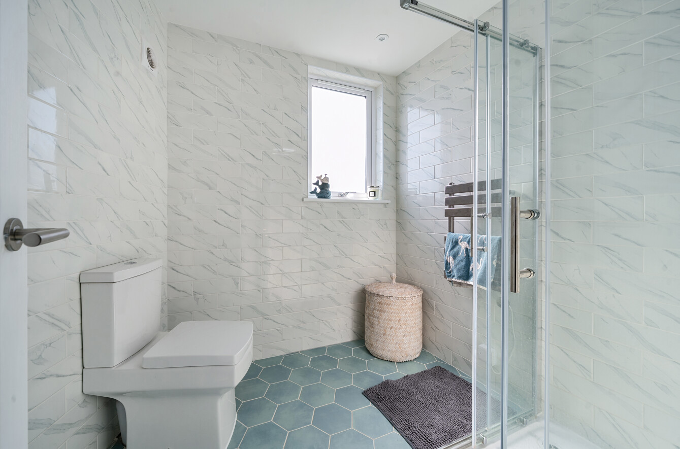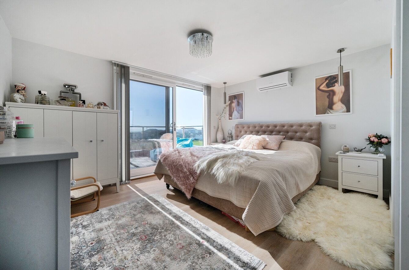 Upstairs, the second floor hosts two further double bedrooms, including a serene principal suite with access to a private balcony overlooking the water. The bedrooms are served by two beautifully fitted bathrooms, including a luxurious family bathroom and a separate shower room, ensuring comfort and convenience for all.