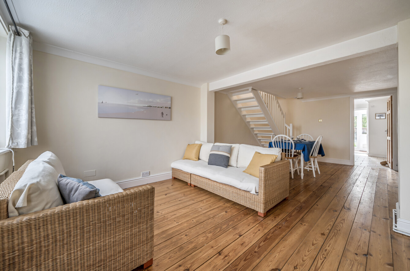 Upon entering, you are greeted by an open-plan sitting and dining area, featuring stripped wooden floors and open stairs to the first floor, creating a warm and inviting atmosphere.