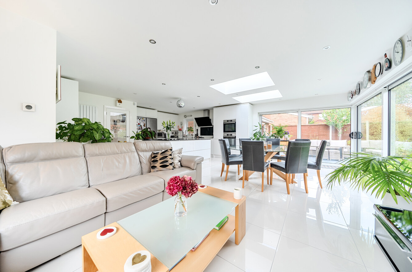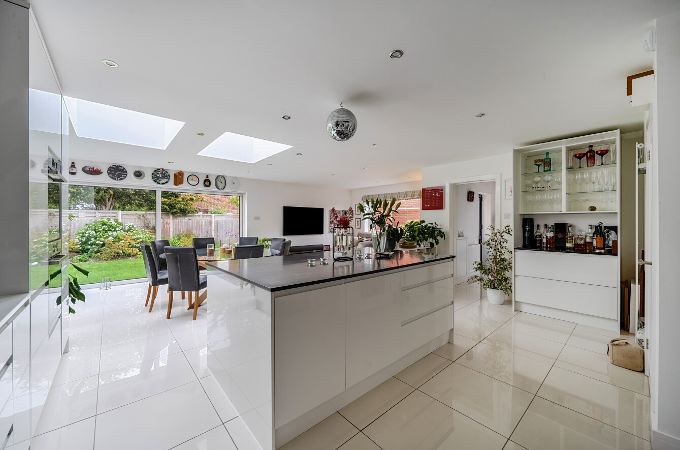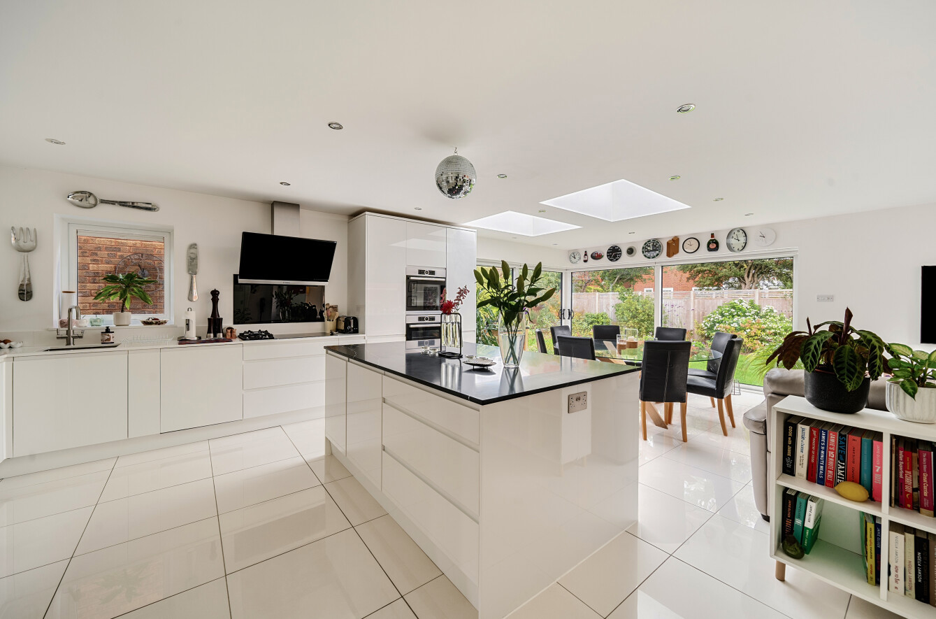 The heart of the home is undoubtedly the impressive open-plan kitchen, dining, and living area. This striking space features a sleek fitted kitchen with central island, integrated appliances, and abundant storage. Expansive sliding doors open directly onto the garden, flooding the room with natural light and creating a seamless connection between indoors and outdoors. It is an inspiring setting for family life and entertaining alike.
