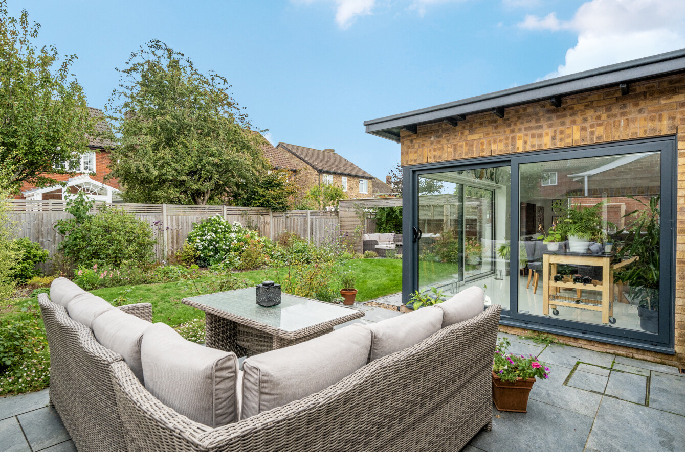 Externally, the property occupies a private plot with a landscaped rear garden, mainly laid to lawn and enhanced by mature planting that provides excellent screening. A charming pagoda offers a sheltered space for al fresco dining and relaxation. To the front, a detached double garage and generous driveway provide ample parking.
