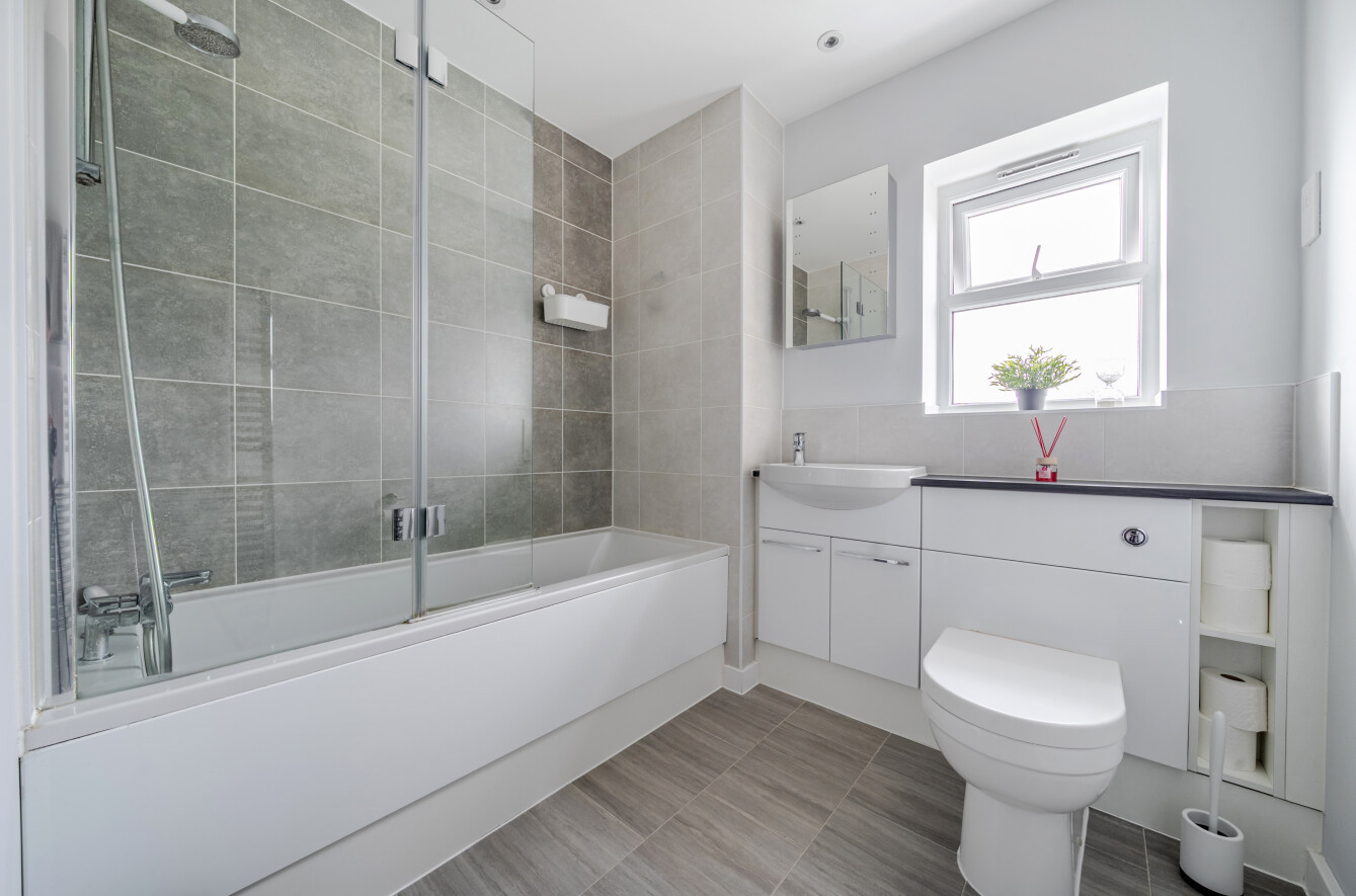 The large contemporary bathroom features a shower over bath, a double cupboard housing the water tank, and built-in shelving providing excellent additional storage.