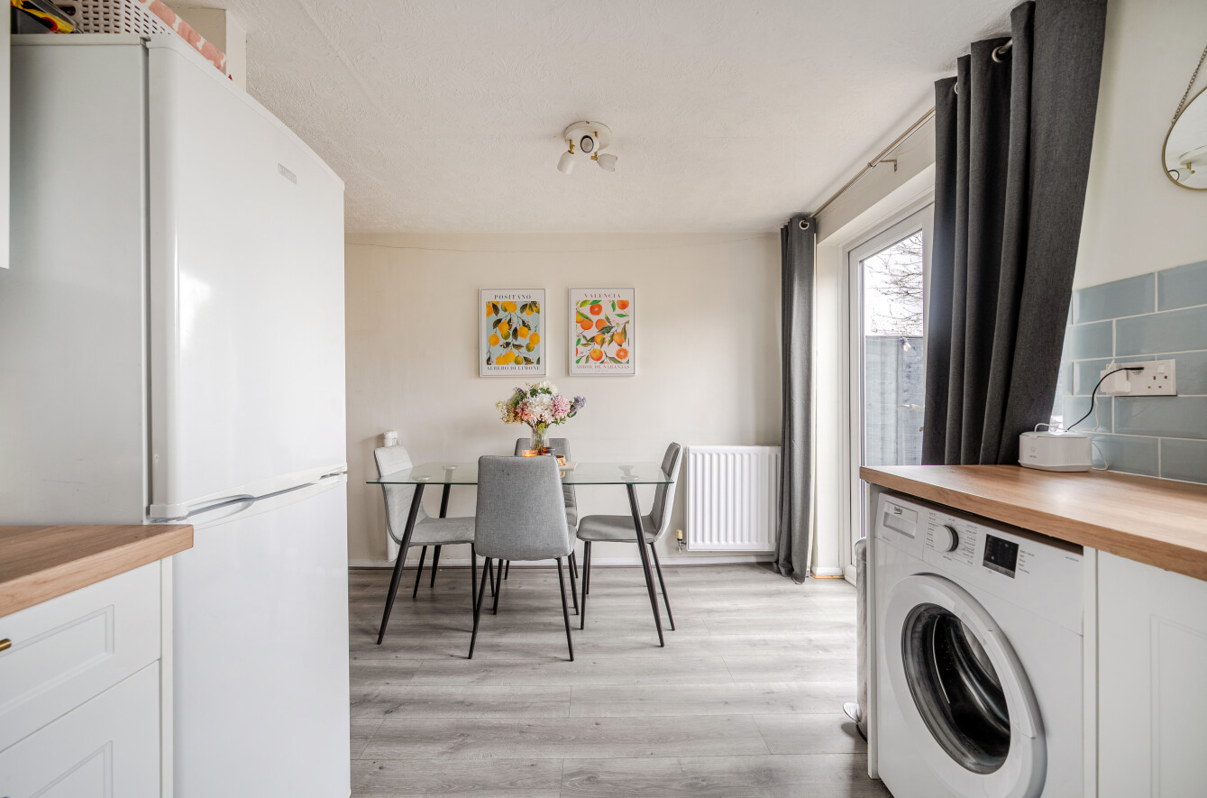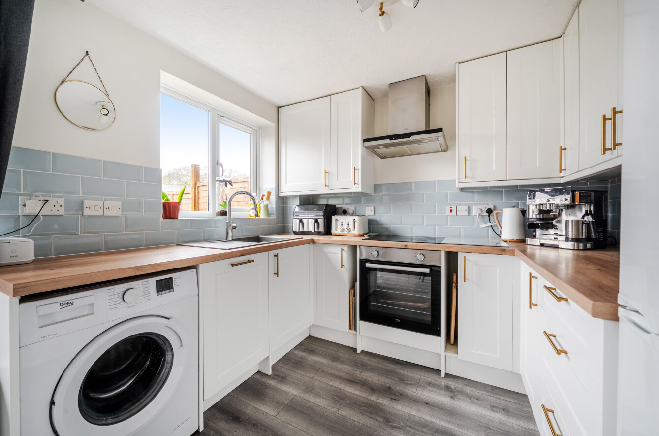 To the rear, the contemporary kitchen has been carefully designed to maximise space and functionality, featuring sleek units, integrated appliances and excellent worktop space. Natural light enhances the room, making it both practical and visually appealing.
