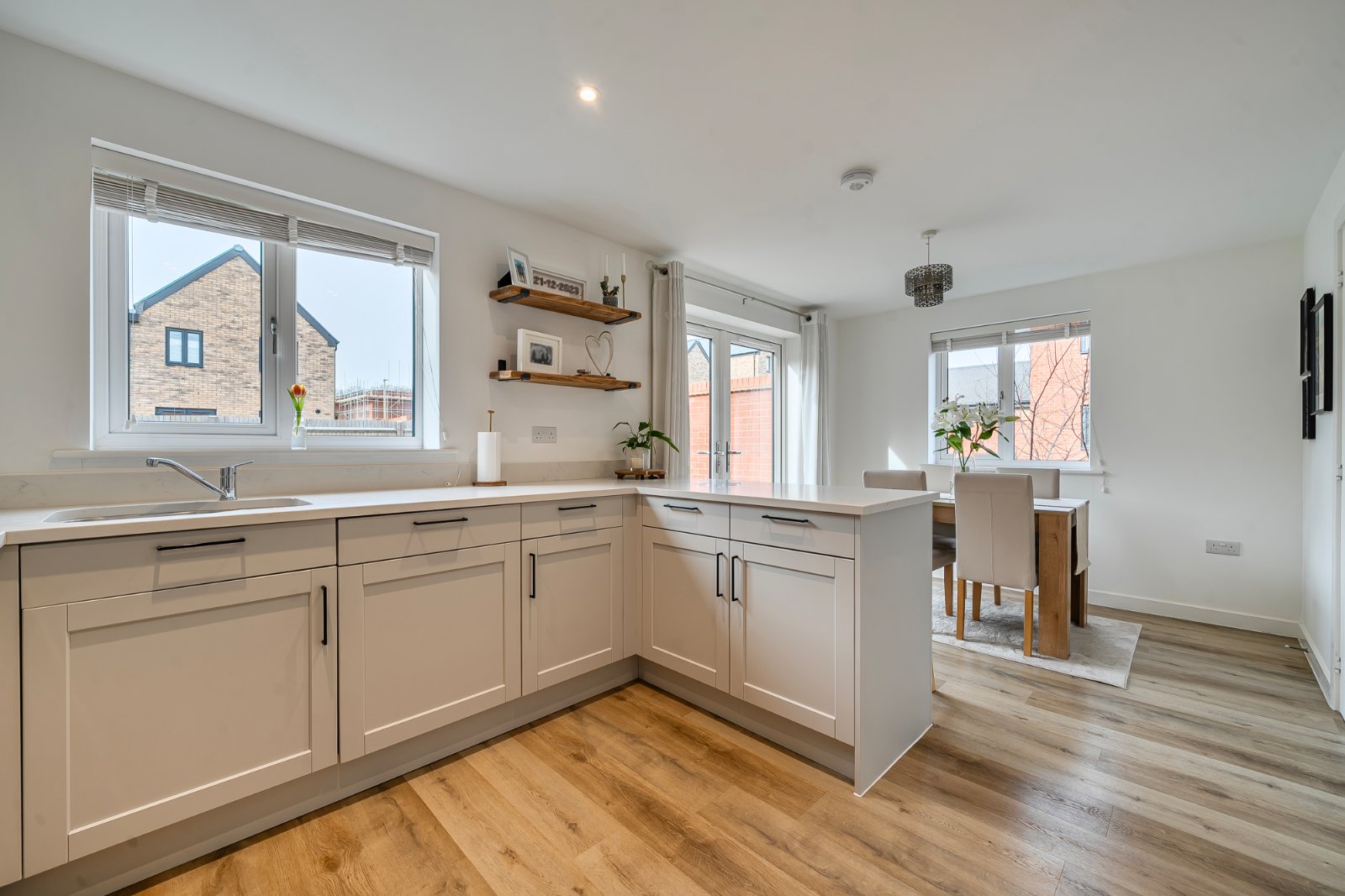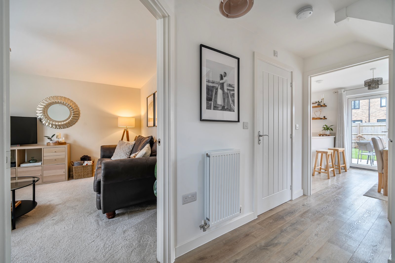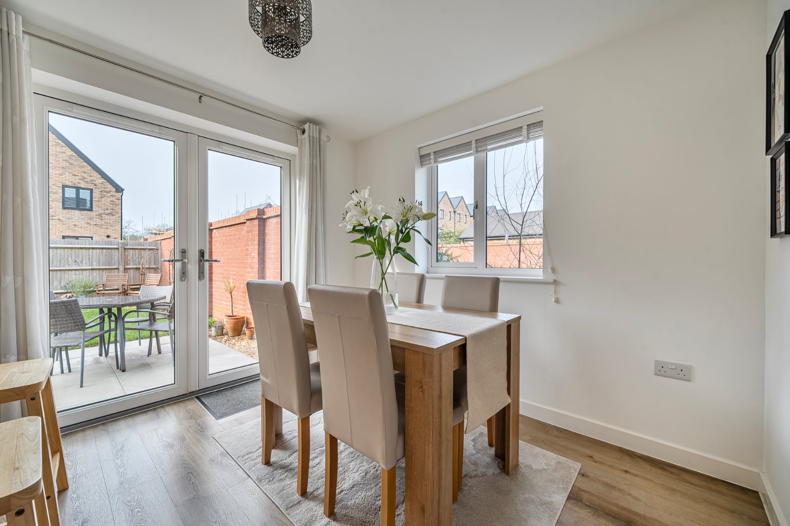 Upstairs, three well-proportioned bedrooms offer flexible accommodation. The generous principal bedroom benefits from a stylish en-suite shower room, while two further bedrooms are perfectly suited to family living, guest accommodation, or home working.