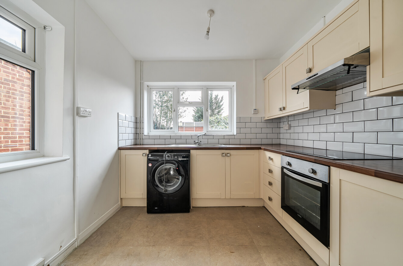 The ground floor comprises a separate, well-proportioned kitchen, ideal for everyday cooking, with space for essential appliances and storage. The entrance hall leads to the staircase rising to the first floor, creating a clear distinction between living and sleeping areas.