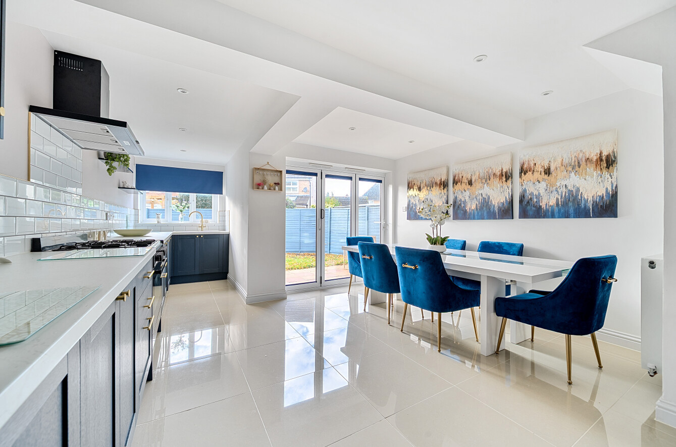 The impressive designer kitchen/dining room is finished to the highest standard, fully fitted with clever storage solutions, along with feature bi folding doors to the outside dining area and garden beyond.