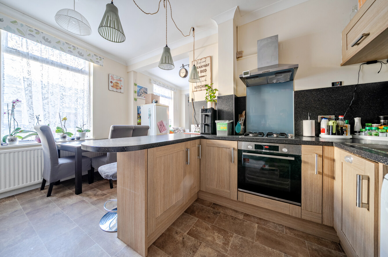 The ground floor features a generous sitting room with ample space for both relaxing and entertaining, leading through to a modern kitchen/dining room at the rear. The kitchen is thoughtfully laid out, providing good worktop space and room for dining, with direct access to the stairwell and ground floor cloakroom.