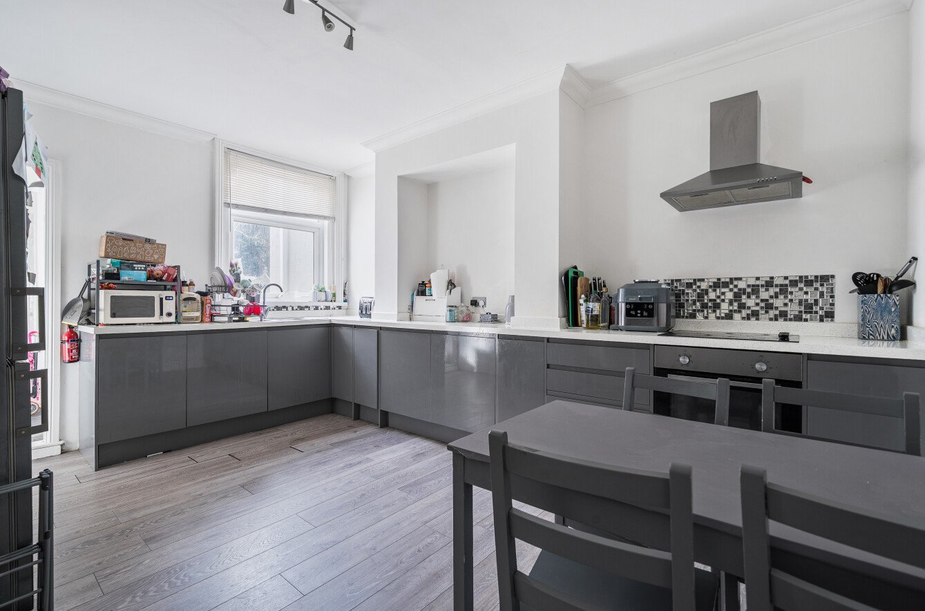 Accessed via its own private entrance, the property opens directly into a large and welcoming kitchen/dining room, creating an impressive first impression. Offering ample storage and generous worktop space, this sociable area is perfectly suited to everyday living as well as entertaining.