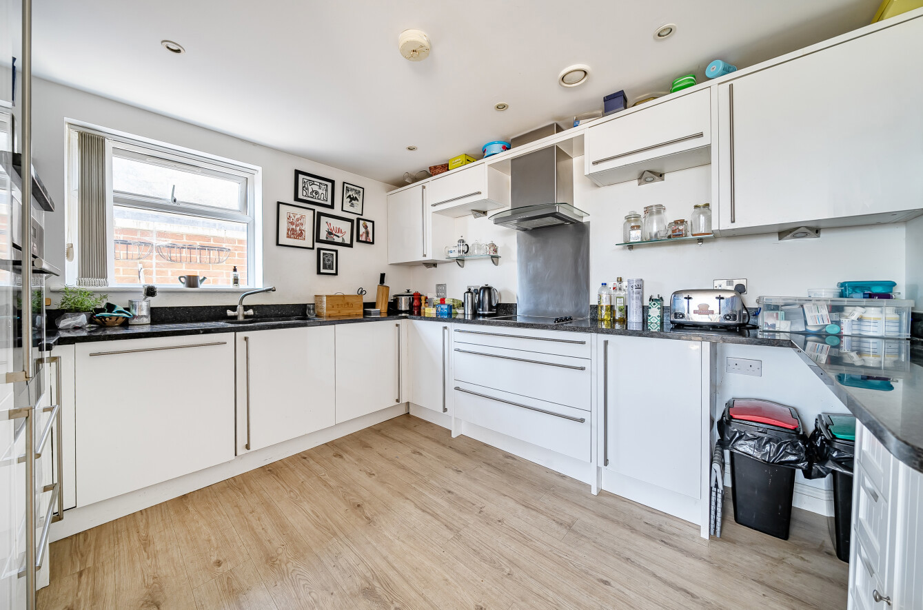 The spacious open-plan living area forms the heart of the home, featuring elegant hardwood flooring and a seamless flow between the lounge, dining, and kitchen spaces. The kitchen is sleek and modern, fitted with white cabinetry, contrasting black worktops, stainless steel appliances, and a breakfast bar ideal for casual dining or entertaining.
