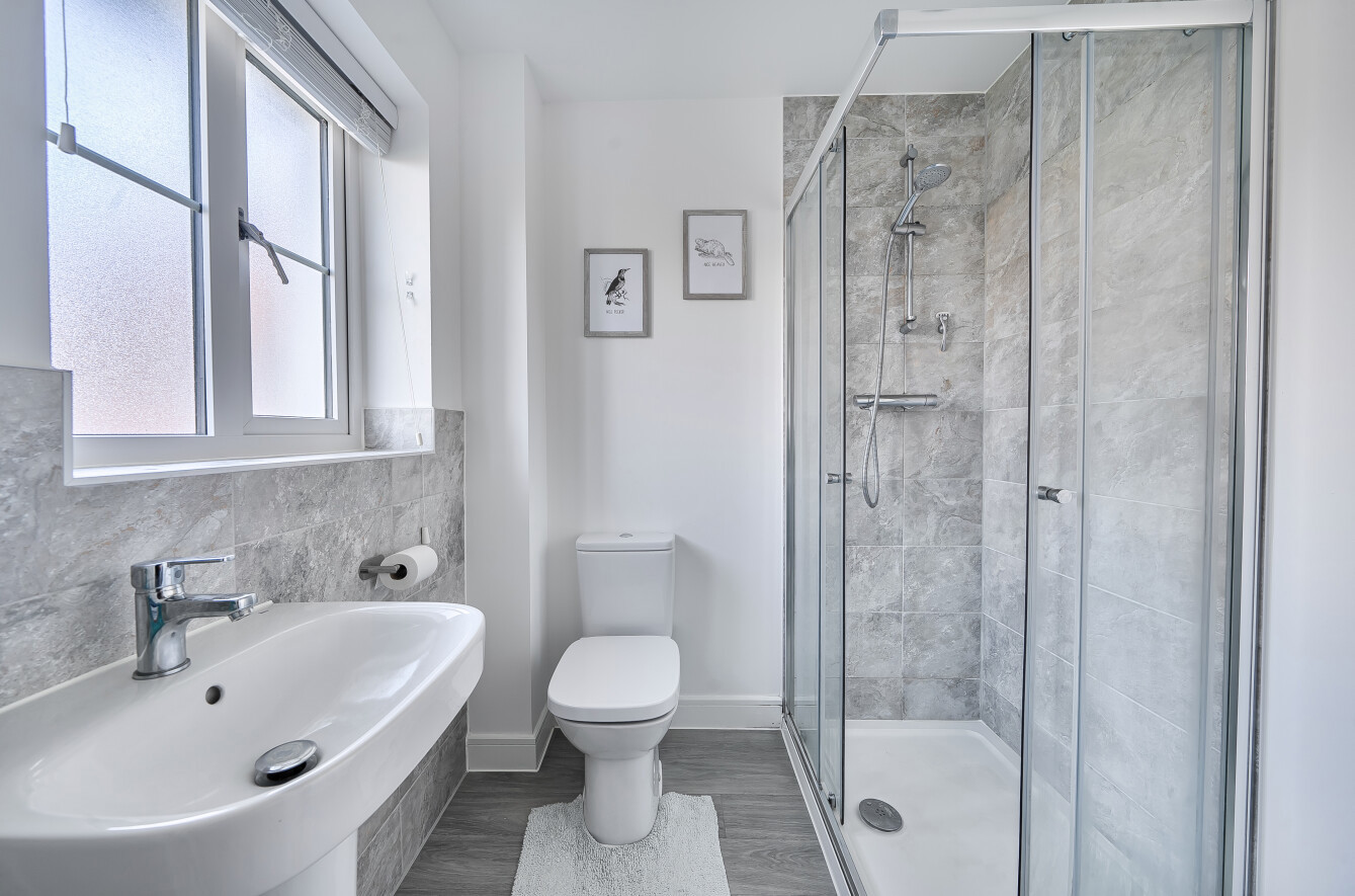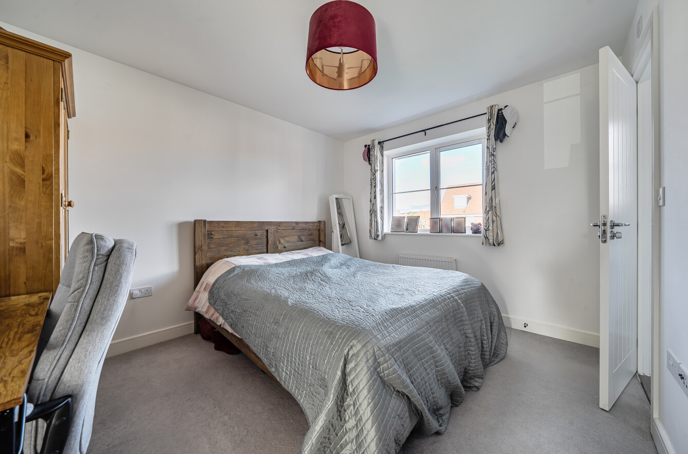 To the rear of the property is a bright and spacious open-plan kitchen/dining room, spanning the width of the house and providing an ideal space for both everyday living and entertaining. This area benefits from direct access to the rear garden, enhancing the sense of light and indoor-outdoor flow. On the first floor, the principal bedroom features a modern en-suite shower room, while the second bedroom is a well-proportioned double, served by the family bathroom.