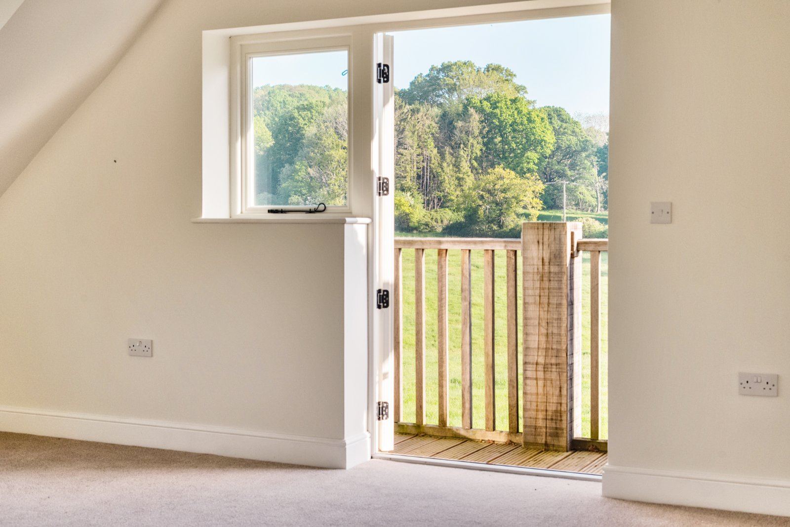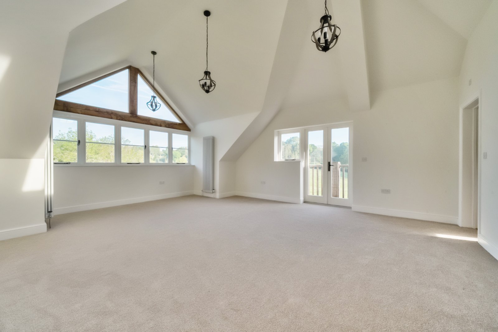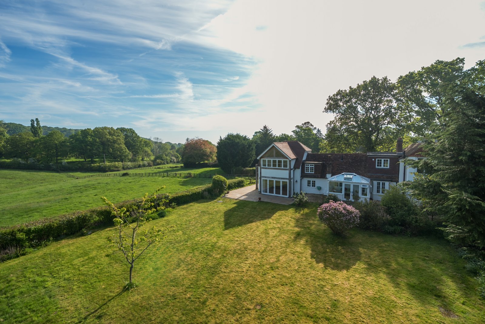The principal suite features a spectacular vaulted ceiling, dressing room, and a stylish en suite, all complemented by far-reaching countryside views. Benefitting from being on an elevated plot of approximately 0.4 acres, the property enjoys exceptional views across adjacent agricultural land from both the ground and first floors. A long gravel driveway provides ample off-road parking, while the lovely garden offers a tranquil retreat.