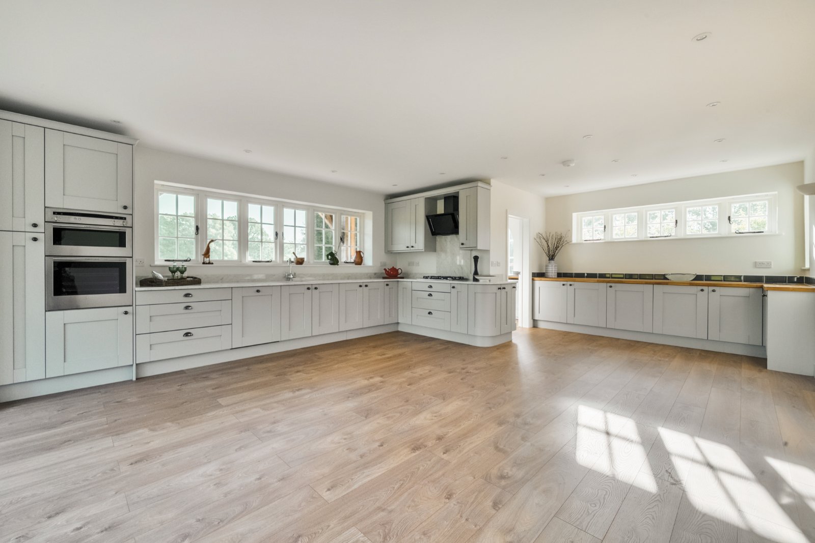 The heart of the home is the stunning kitchen/breakfast and dining room, finished to a high specification with a range of sleek units, contrasting worktops, and double doors opening onto the rear garden and sun terrace—ideal for entertaining and family living. Upstairs, the property continues to impress with four comfortable bedrooms.