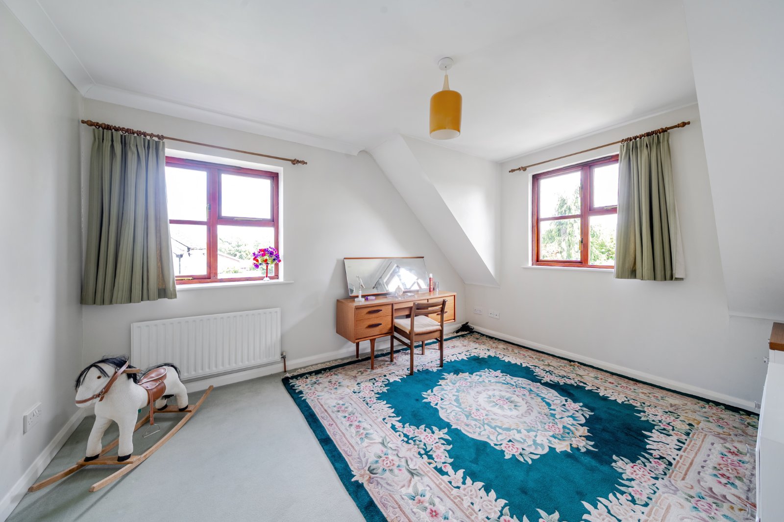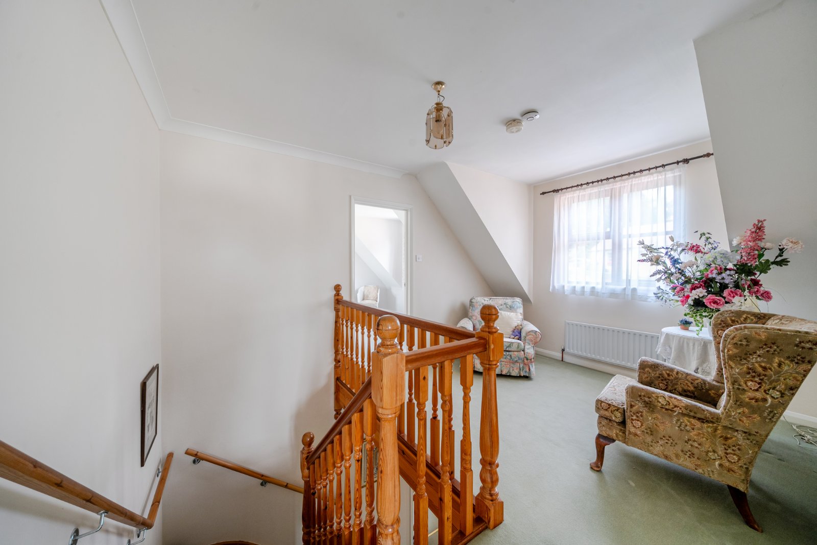 Upstairs, three generously sized bedrooms enjoy pleasant outlooks over the rear garden. A spacious landing filled with natural light enhances the airy feel of the upper floor. The family bathroom is well-appointed with a classic white three-piece suite. Above the garage, an expansive loft room currently serves as excellent storage but presents exciting potential for conversion, subject to the necessary planning consents.