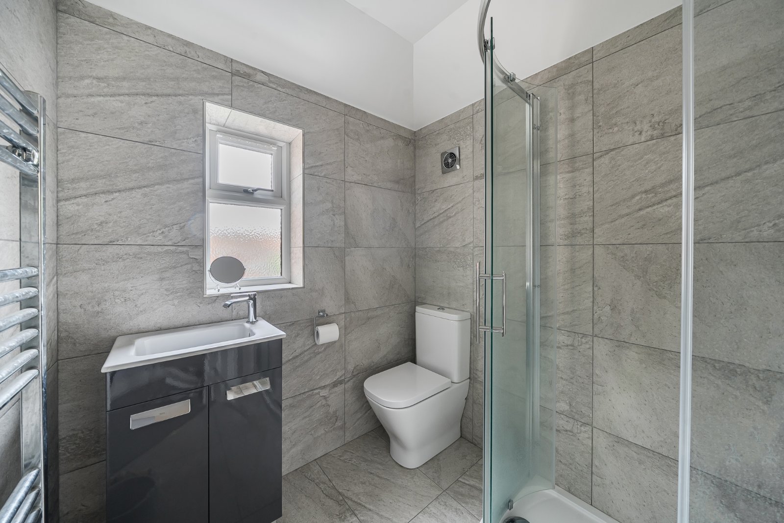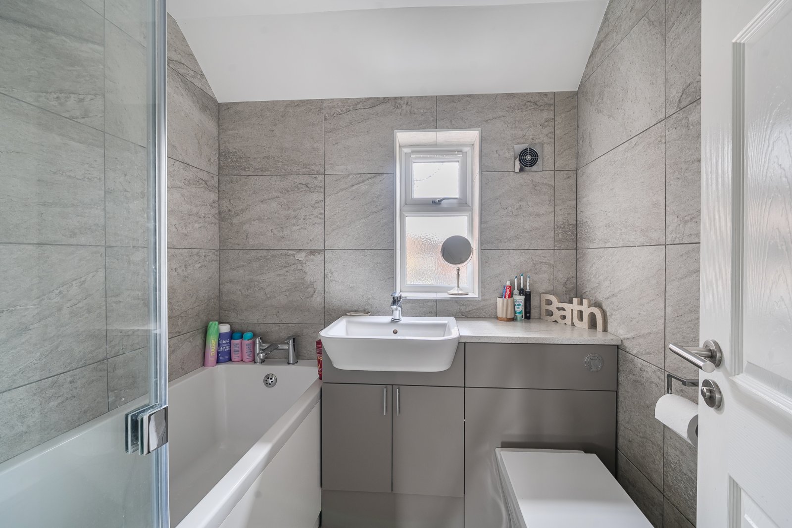 Upstairs, the property offers three generously sized double bedrooms, two of which benefit from built-in wardrobes. The principal bedroom boasts a modern en-suite shower room, while the additional bedrooms are served by a well-appointed family bathroom featuring a three-piece suite with an overhead shower above the bath.